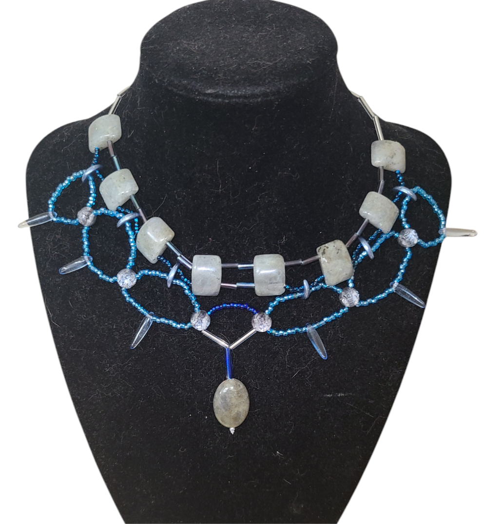 Geometric and grounded, this necklace features chunky labradorite cubes arranged in a tiered, collar-style design. The layered arcs of deep blue and silver glass beads form a crisp lattice beneath, adding structure and contrast. A single labradorite drop anchors the piece at center. The overall effect is bold but not flashy—great for adding edge to a clean neckline. Try it with a strapless jumpsuit, a black turtleneck, or a crisp collared shirt for a sharp, confident look.