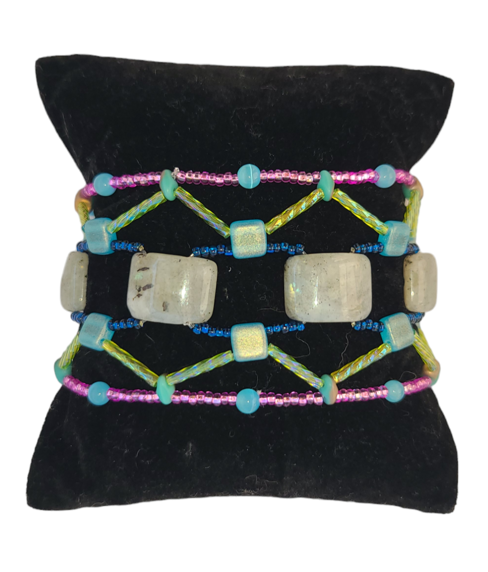 Capture the mystical allure of labradorite with this bracelet, designed to reflect the gemstone’s iridescent flashes of blue and green. The bracelet’s symmetrical, interlocking structure highlights the natural beauty of the stones, while coordinating seed beads add texture and depth. This versatile piece complements both casual and formal outfits, making it a must-have for any jewelry collection. Pair it with dark or jewel-toned attire to enhance its captivating shimmer.