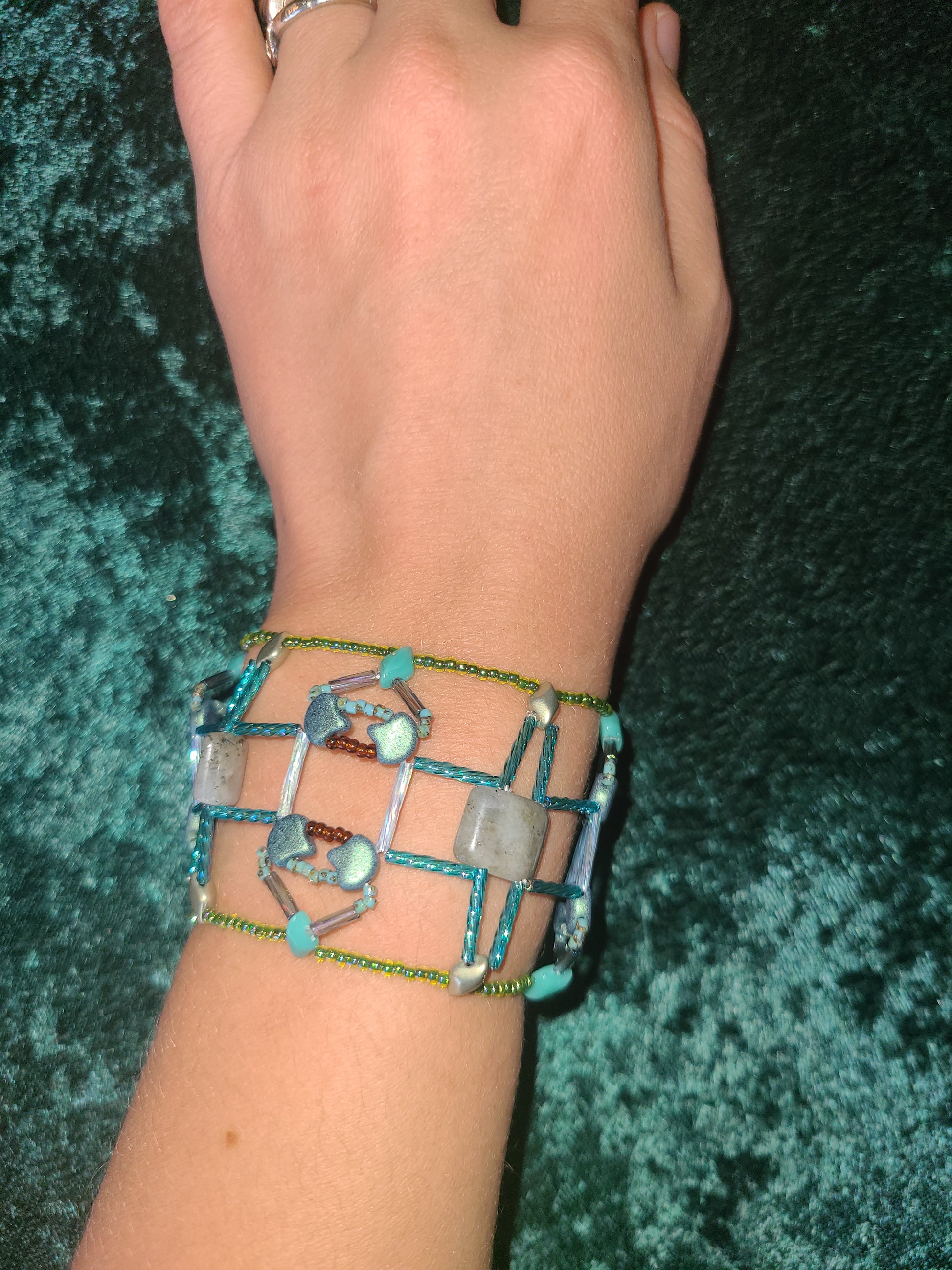 Immerse yourself in the mystical allure of this cool-toned bracelet, a design that celebrates the enchanting flashes of labradorite. Featuring polished labradorite stones framed by earthy green and teal beads, this bracelet captures a natural, organic beauty. The intricate arrangement of beads enhances the iridescent qualities of the labradorite, making each glance a journey through shimmering hues. Perfect for casual outings or evening ensembles, this bracelet pairs effortlessly with neutral tones, denim, or earthy palettes. Whether worn solo or layered, it’s a must-have for anyone who loves accessories that tell a story.