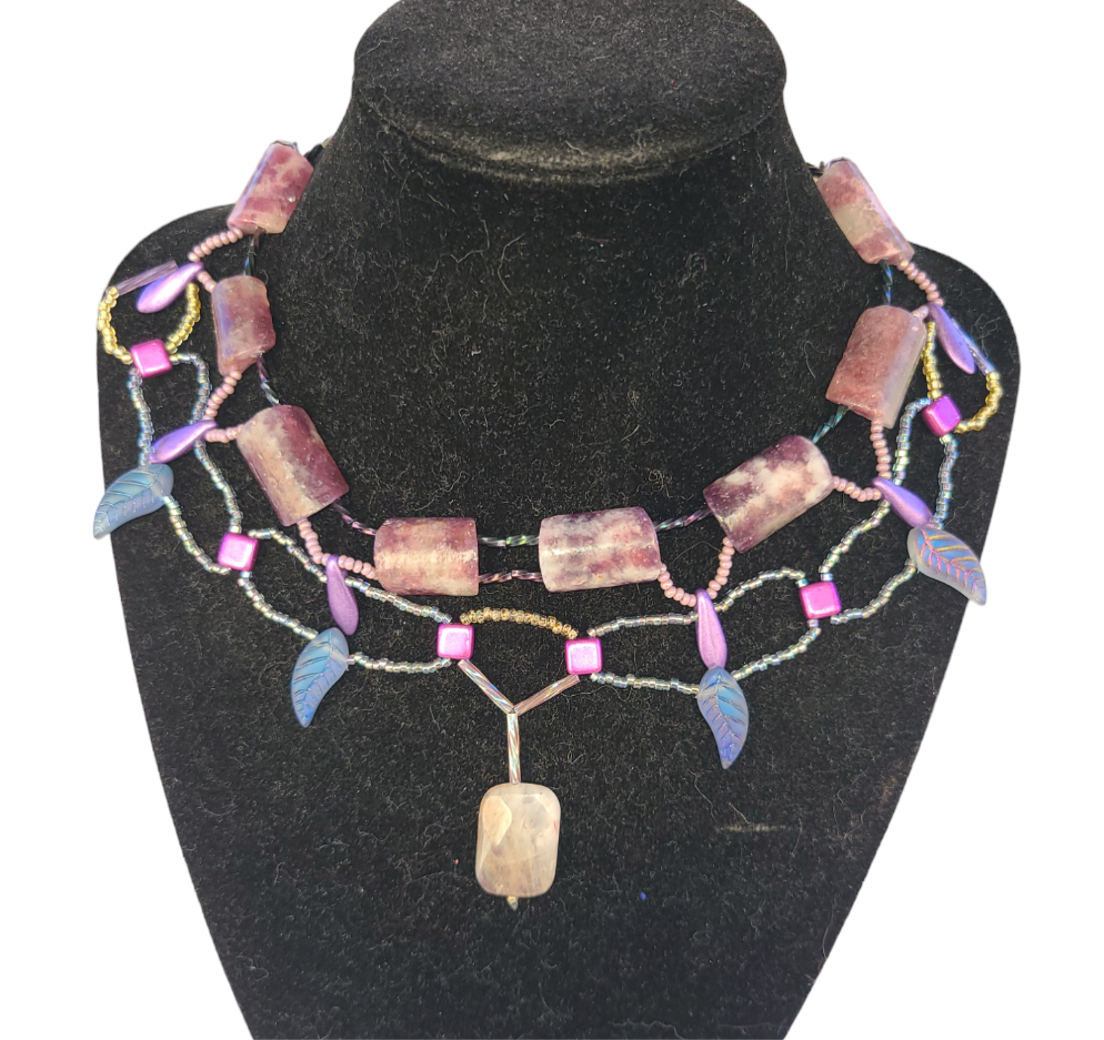 Featuring soft lavender Lepidolite stones, this necklace combines purple tones with vibrant pops of pink and green for a fresh, floral-inspired aesthetic. Leaf-shaped beads cascade alongside the Lepidolite, creating a layered design with playful yet sophisticated charm. A statement accessory for those who embrace color and artistry in their style.