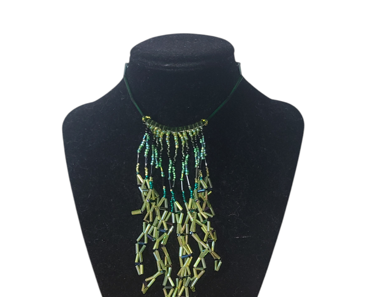 This striking necklace features cascading lime-green glass seed beads arranged into a geometric triangle pattern. The vibrant design brings to mind the lush energy of tropical jungles, while its lightweight construction ensures comfort for all-day wear. Whether layered over a summer dress or paired with neutral tones, this waterfall necklace is a versatile statement piece that celebrates bold, artistic design and uniqueness.