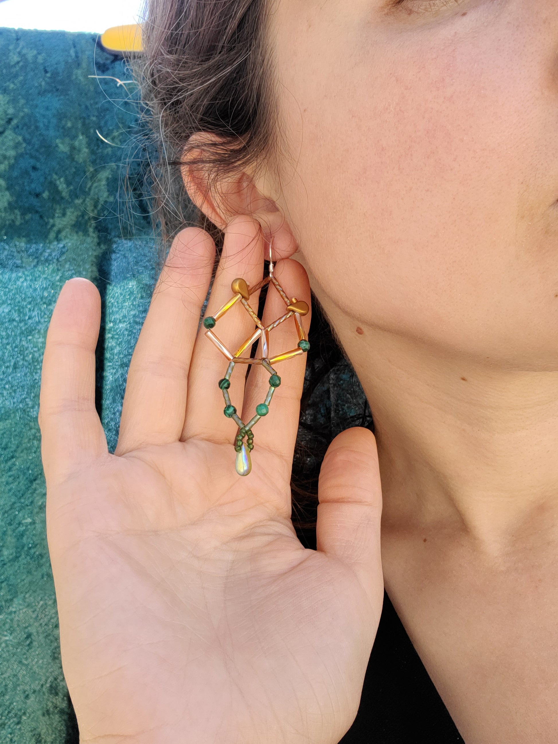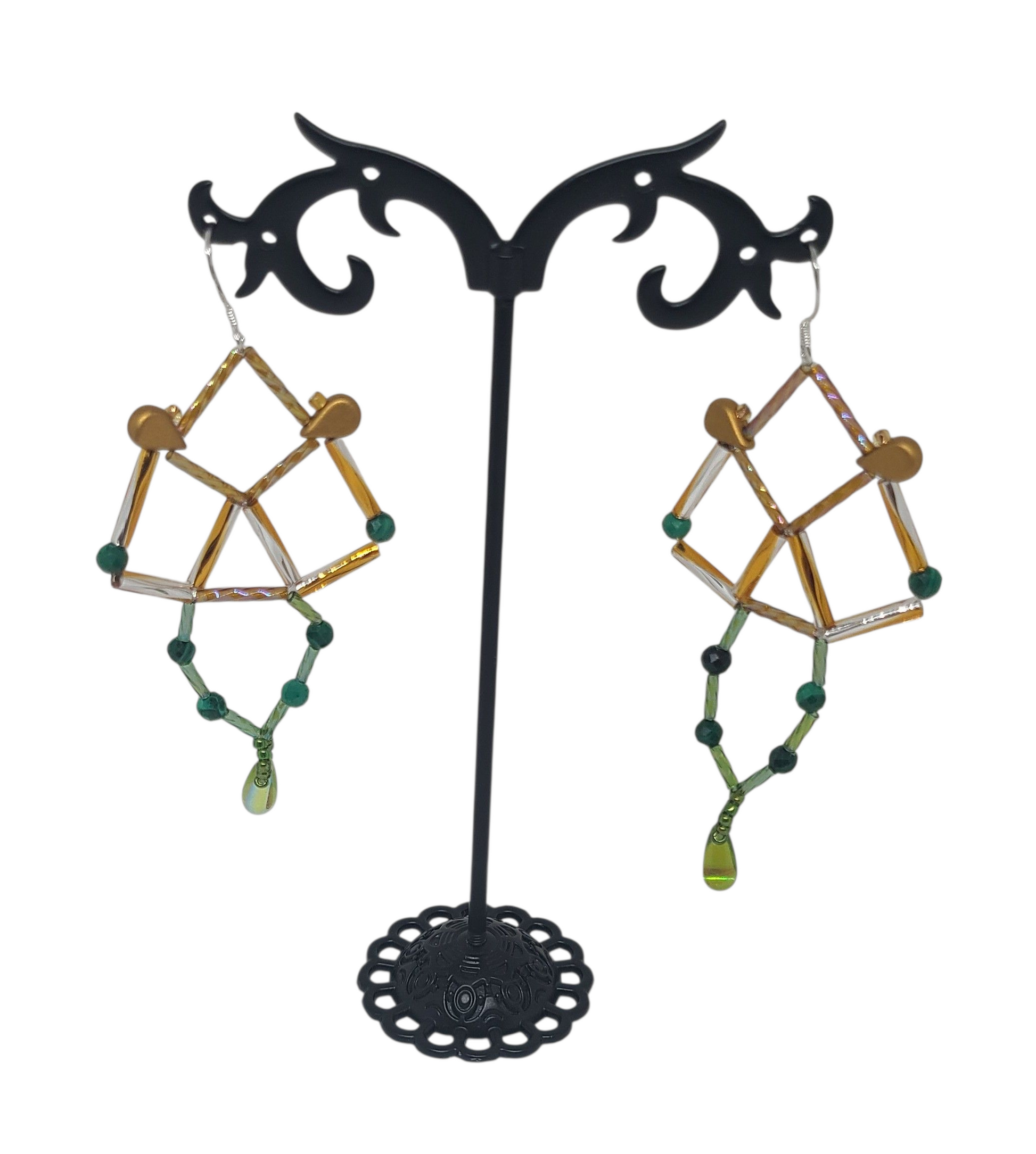 Polished malachite stones and olive-green accents are arranged in a sharp, diamond-shaped frame of orange and green lattice beadwork. Finished with a single green glass focal drop, these beaded geometric earrings have a clear, architectural shape without feeling heavy.