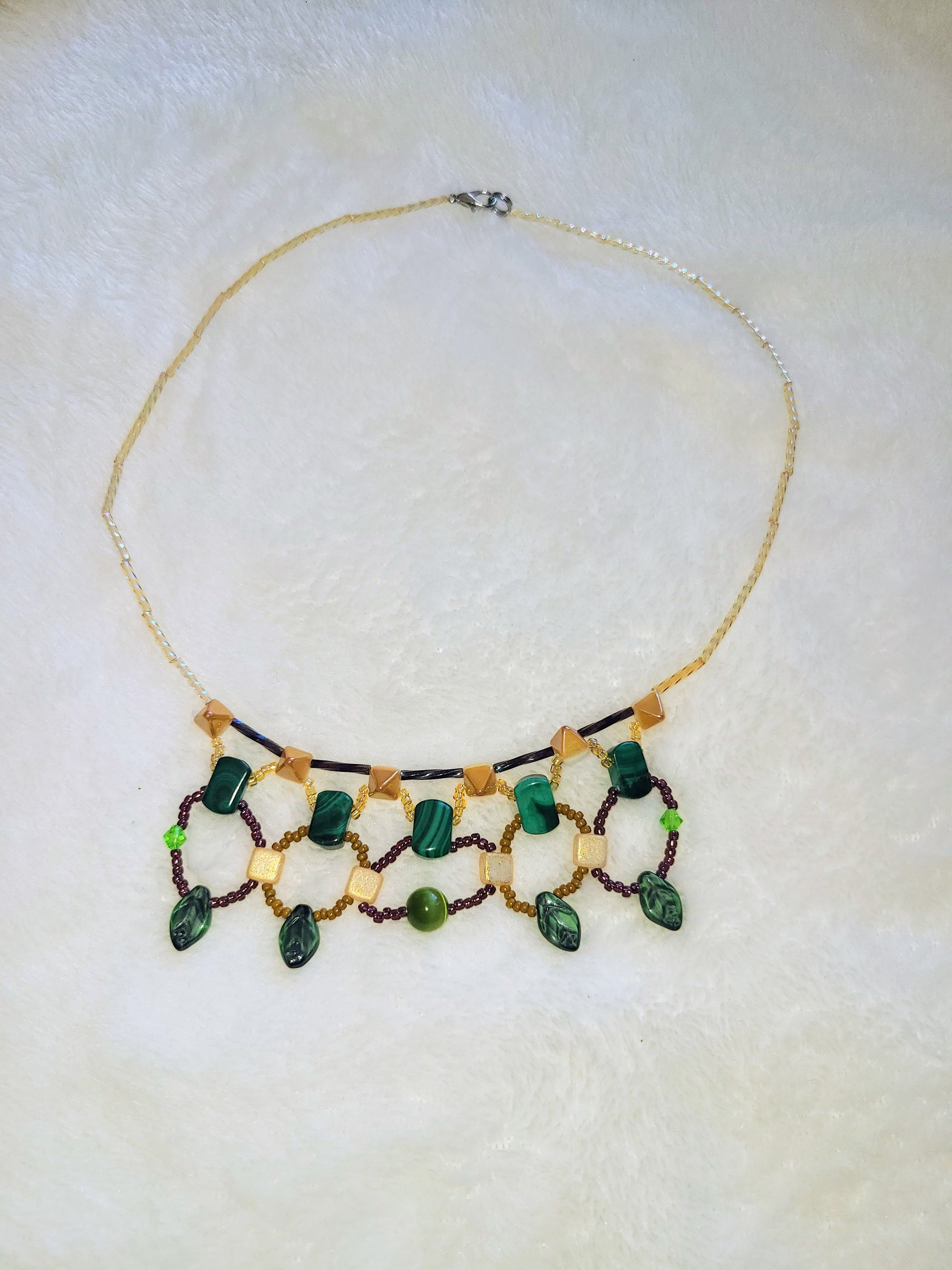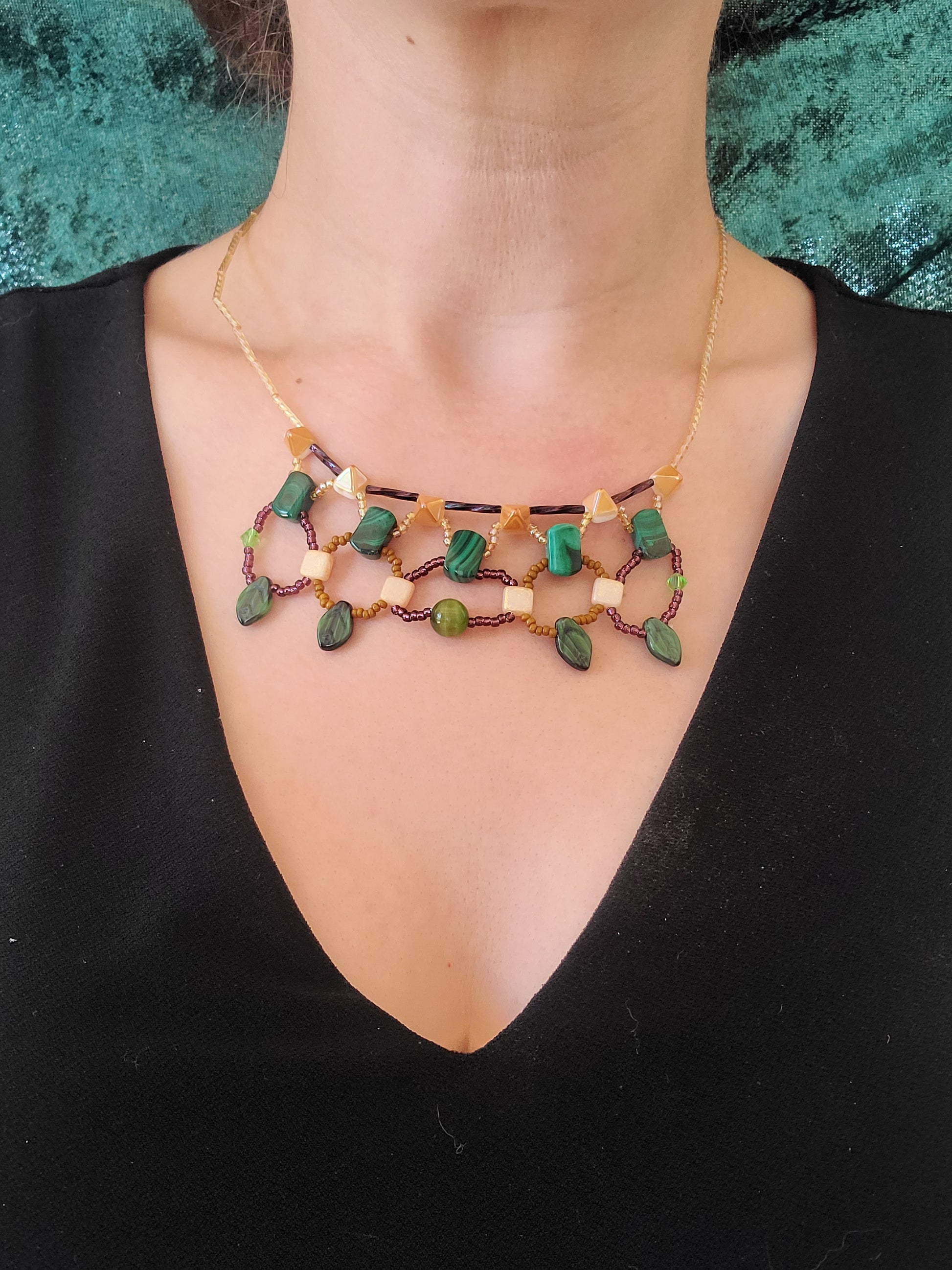 A bold geometric pattern in deep green and mustard tones gives this woven malachite necklace its edge. The netted structure has an architectural feel, with rectangular malachite beads adding texture and color variation. Wear it with a square neckline or a crisp button-down shirt for a look that’s a little artsy yet a little structured. Ideal for gallery nights or a day where you want to show up with personality.
