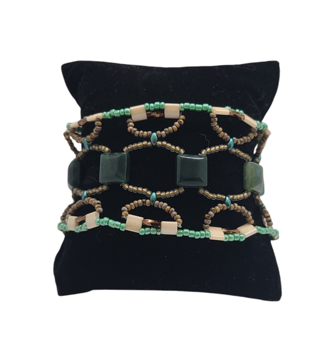 This bracelet is a celebration of free-spirited style and intricate craftsmanship. This design showcases deep green moss agate stones woven into an arching lattice of golden seed beads and earthy browns. The dynamic interplay of textures and patterns makes this bracelet a perfect accessory for those who embrace eclectic aesthetics. Pair it with flowy maxi dresses, embroidered tunics, or even tailored blazers for a pop of bohemian charm. From casual outings to creative gatherings, this bracelet ensures you stand out with a touch of artisanal flair.