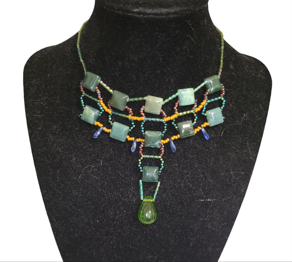 This bold necklace features moss agate stones set in a grid of gold and brown seed beads. The design takes cues from Moroccan silverwork, with linked shapes that give it strong, structured lines. Rows of seed beads along the base add texture, while the green stones show subtle variation in tone.