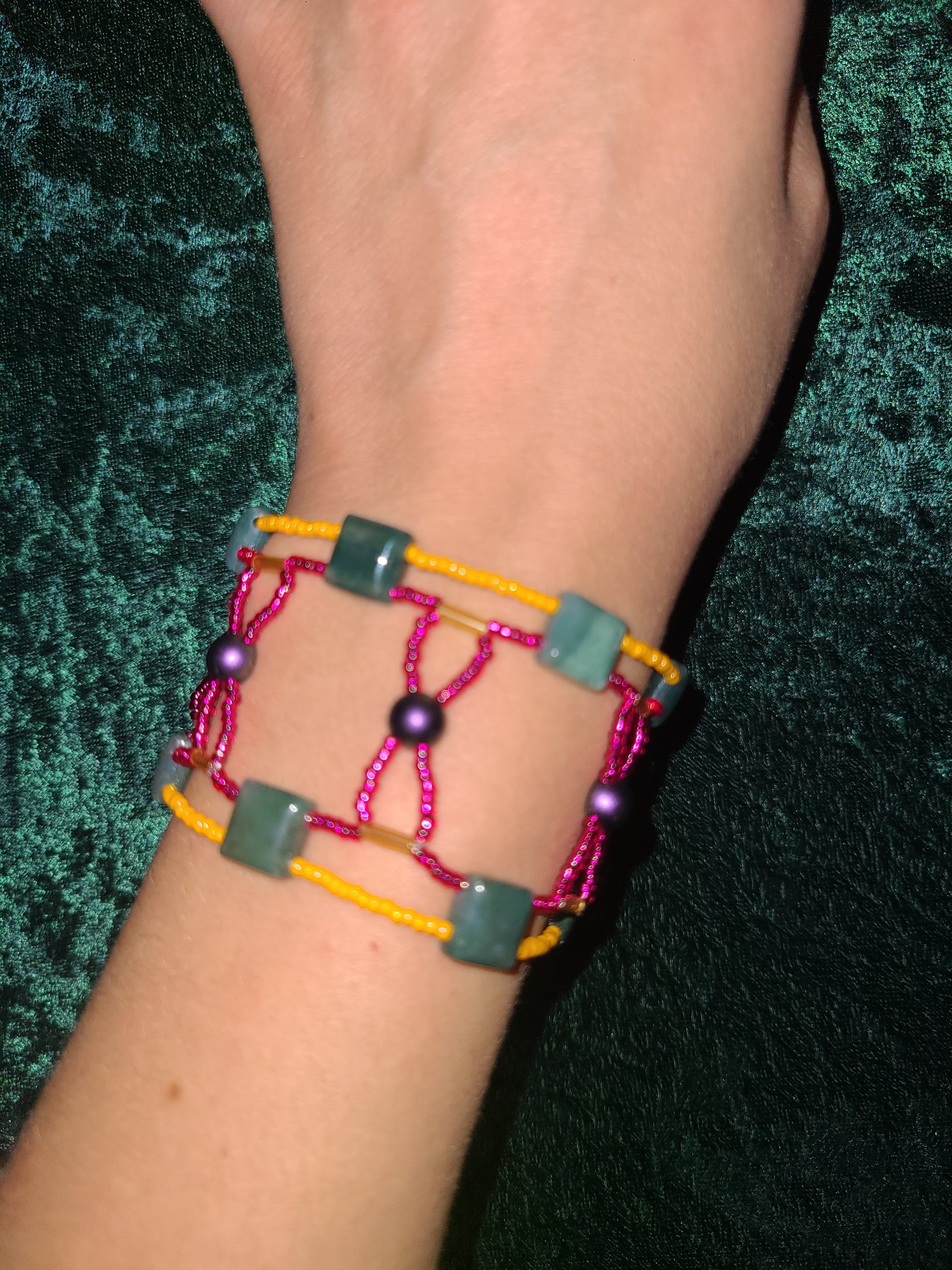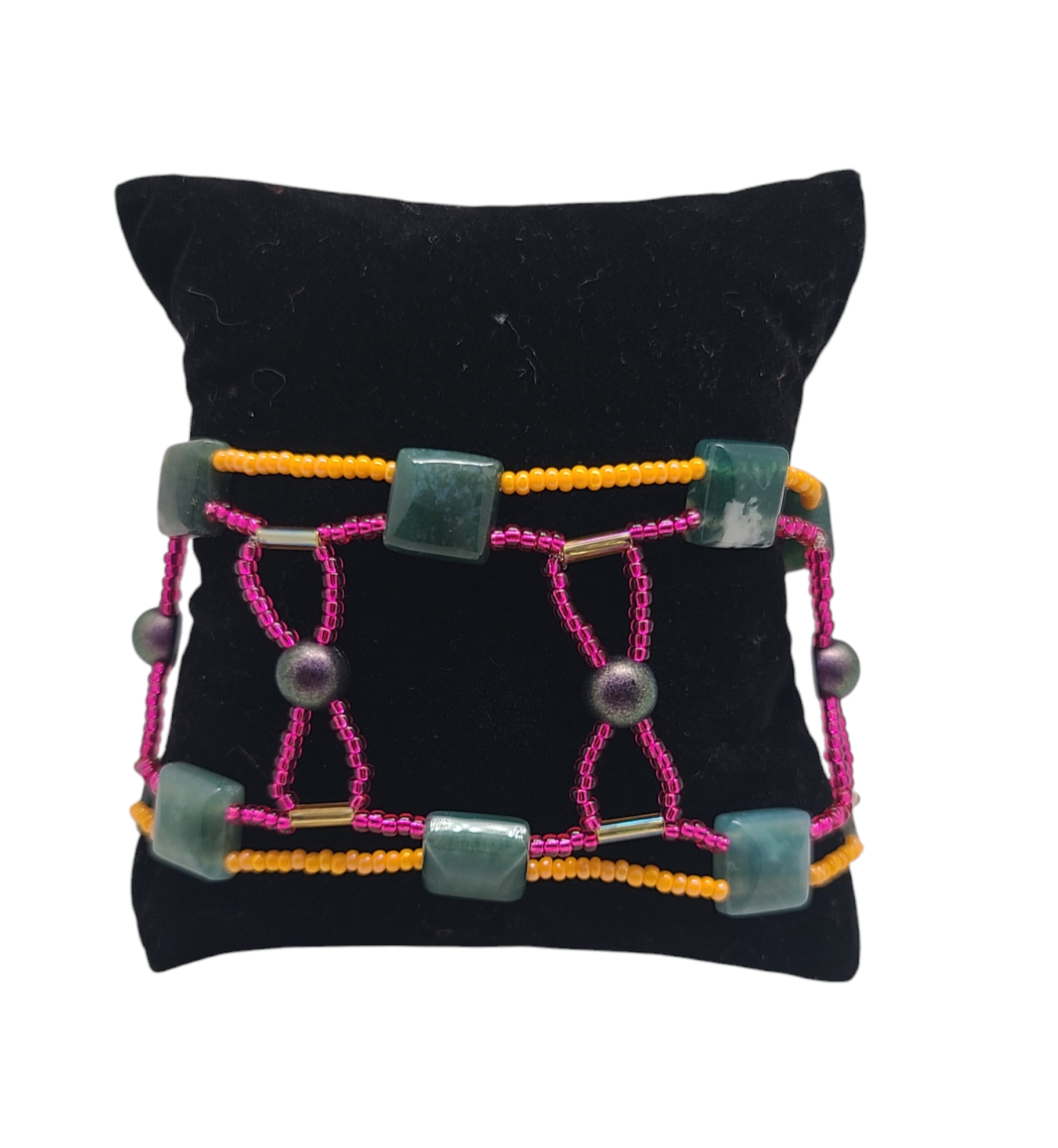 Unleash your playful side with this vibrant bracelet. Bold magenta and orange seed beads provide a striking contrast to the deep green moss agate stones, creating a vivid design reminiscent of colorful cityscapes under a twilight sky. The mosaic-inspired pattern brings energy to any outfit, making it an ideal accessory for creative occasions. Wear it as a standout piece with neutral tones or layer it with other colorful bracelets to amplify its bold charm.