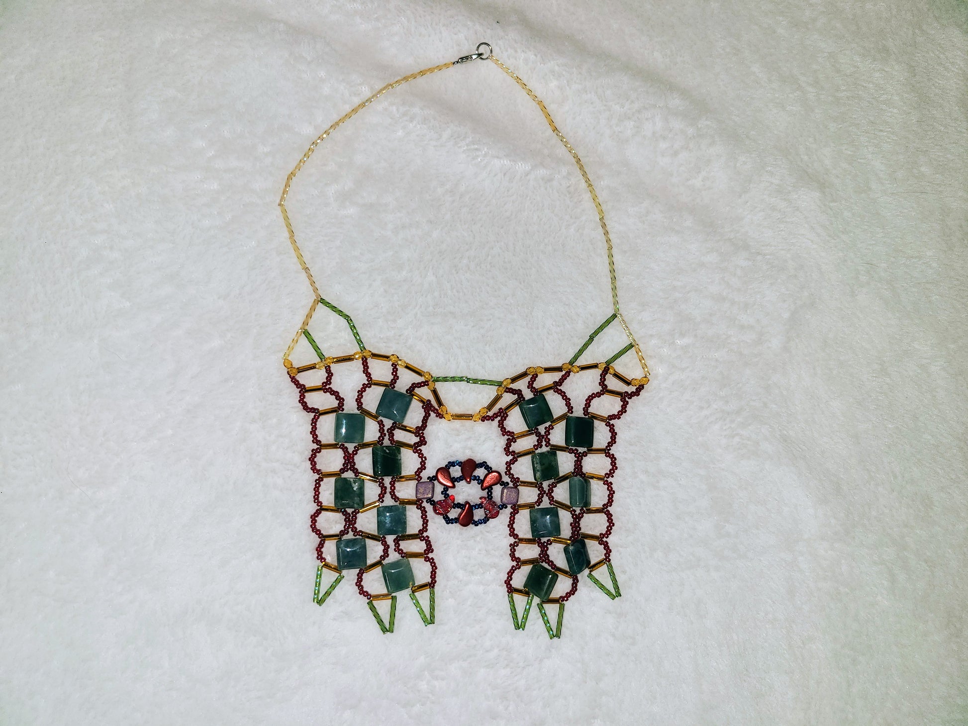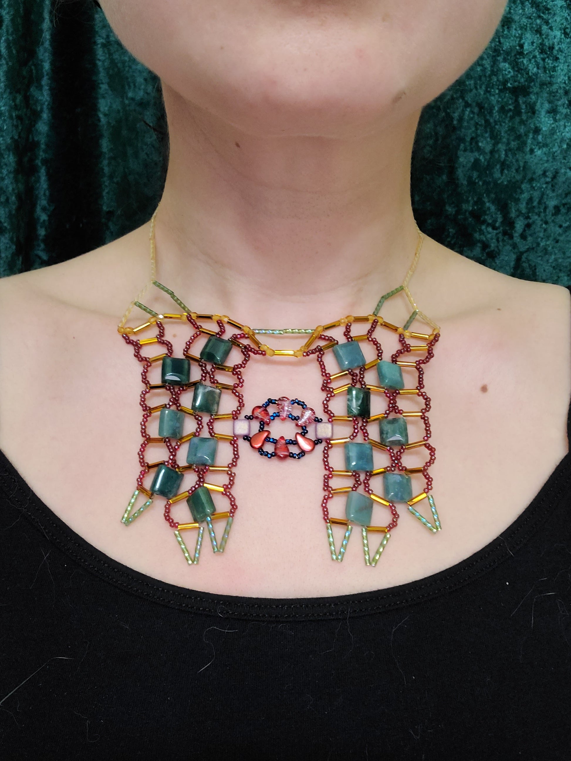 This necklace embodies the elegance of ancient Egyptian-inspired design, centering on natural moss agate stones with their rich green inclusions. Each moss agate square is framed by warm-toned beads in amber and crimson hues, creating a striking interplay of earthy and vibrant tones. The centerpiece features a structured arrangement of intricately woven beads, adding depth and visual interest to the design. Angular glass bead elements complete the look, lending a geometric edge that contrasts beautifully with the natural textures of the agate.