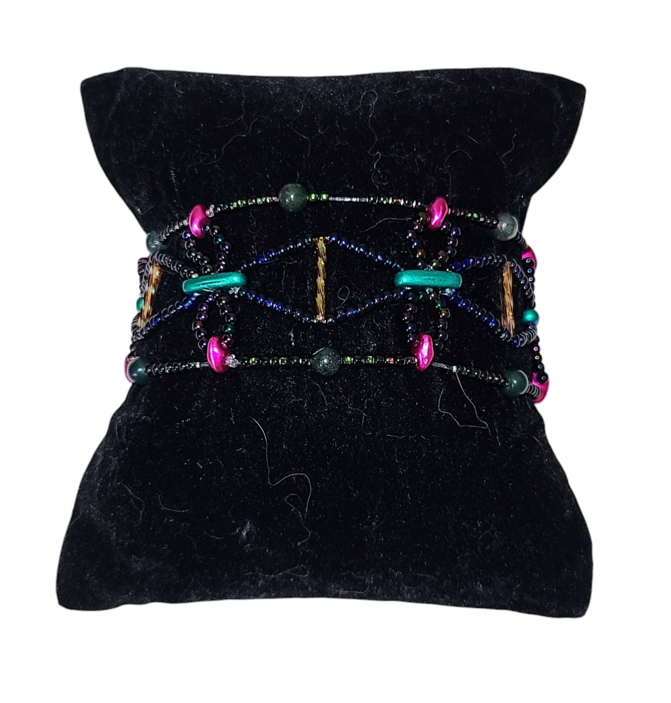 Rich with earthy charm, this bracelet intertwines moss agate beads with bold green and vivid magenta details for a striking contrast. The flowing, arched design adds depth and texture, making it an eye-catching piece for everyday wear or special occasions. Style it with a soft cream blouse and tailored pants for a polished daytime outfit, or layer it with a flowing floral dress for a relaxed evening gathering. The vibrant colors and intricate beadwork make it a versatile accessory for any wardrobe.