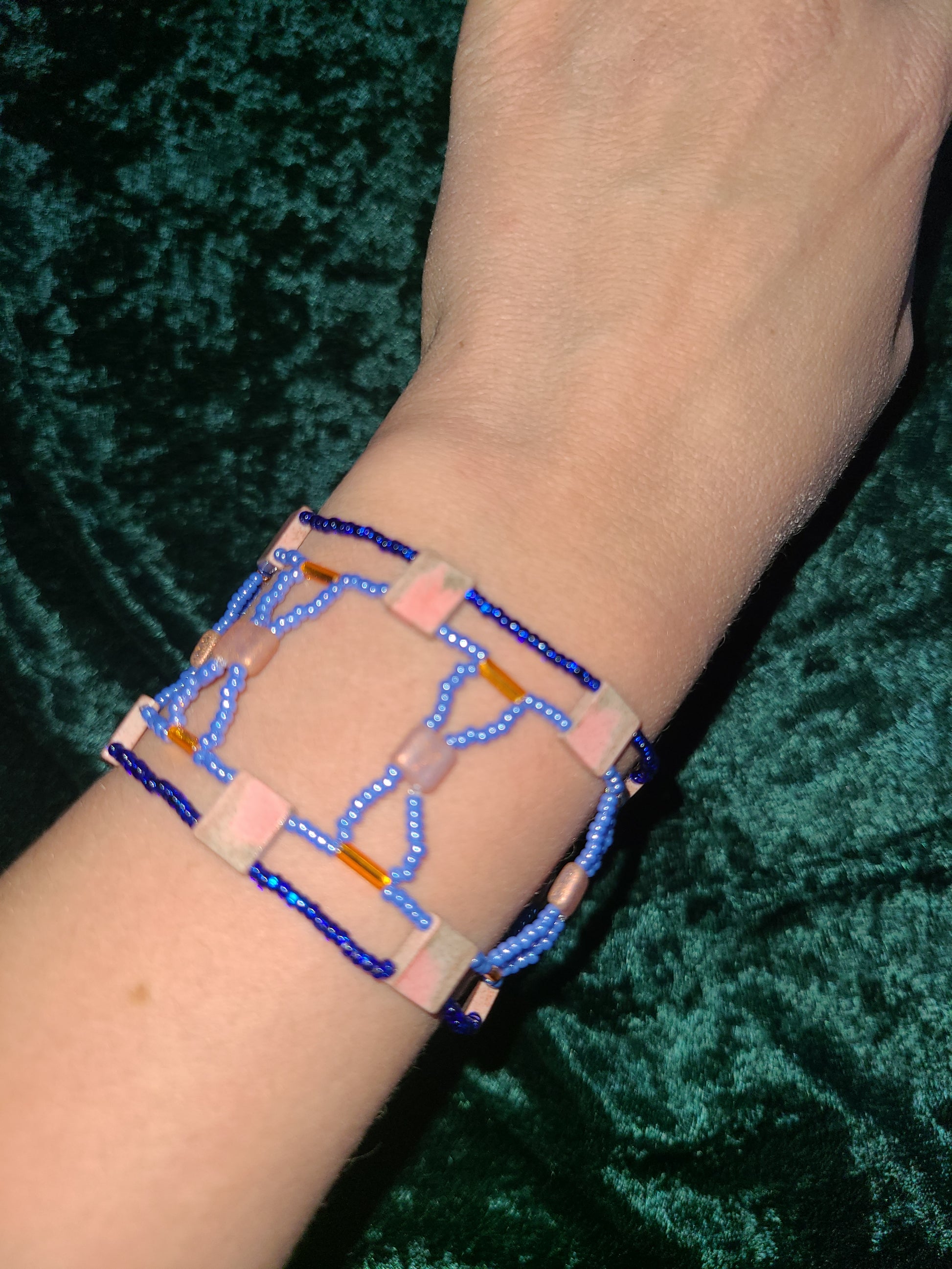 Soft peach agate squares punctuate a network of deep blue beadwork, creating a striking contrast reminiscent of twilight over a desert landscape. Warm amber accents add a subtle glow, while the structured pattern lends a sense of balance and refinement. This bracelet is perfect for elevating a simple black dress for an evening out or pairing with a navy blazer and tailored trousers for a sophisticated work ensemble.