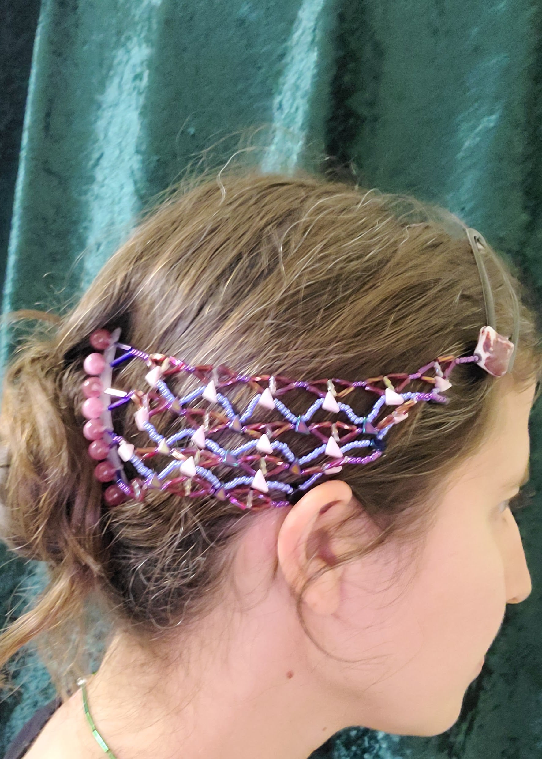 This hair jewelry features a comb adorned with pink cat eye glass beads. Detailed icy blue, deep red, and pink diamond-shaped beadwork runs along the side of the head, secured with a no-slip barrette with a maroon and white glass bead.