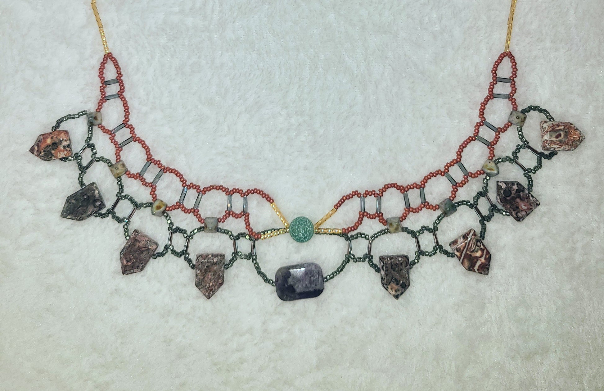 This design was inspired by the intricate jewelry of ancient Egypt. This necklace features detailed beadwork in muted orange and green tones, with pentagon-shaped picture jasper beads at the bottom. At the center is an amethyst rectangle.