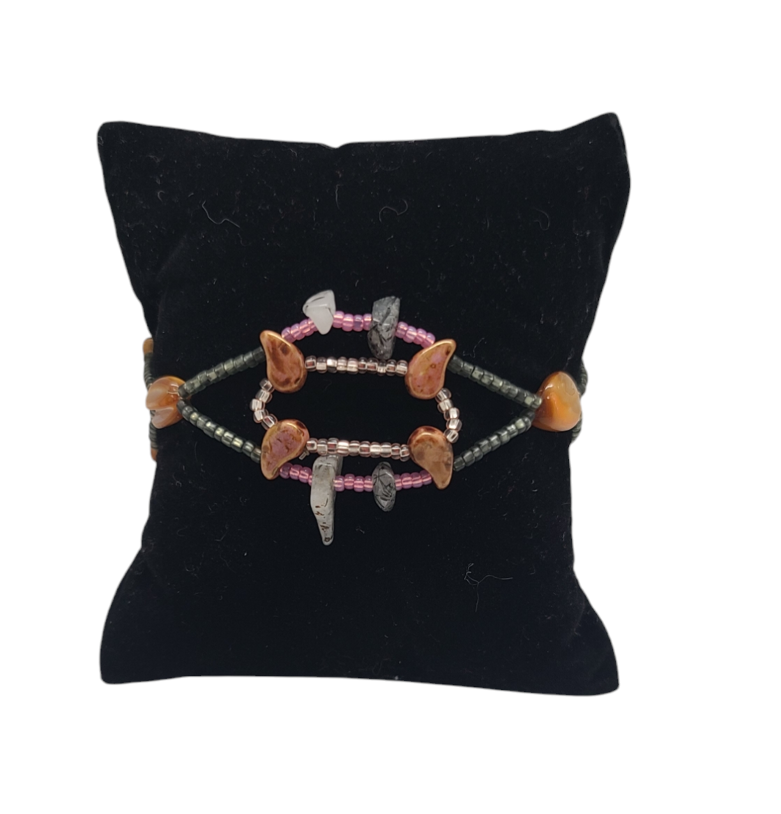 The harmonious blend of peach-toned stones and gray crystal accents creates a fluid wave pattern that wraps elegantly around the wrist. The sophisticated neutral palette offers incredible versatility for any wardrobe. This refined bracelet serves as the perfect accessory for office wear, dinner dates, or wedding guest attire. The subtle colors complement both bold prints and monochromatic ensembles with equal sophistication.