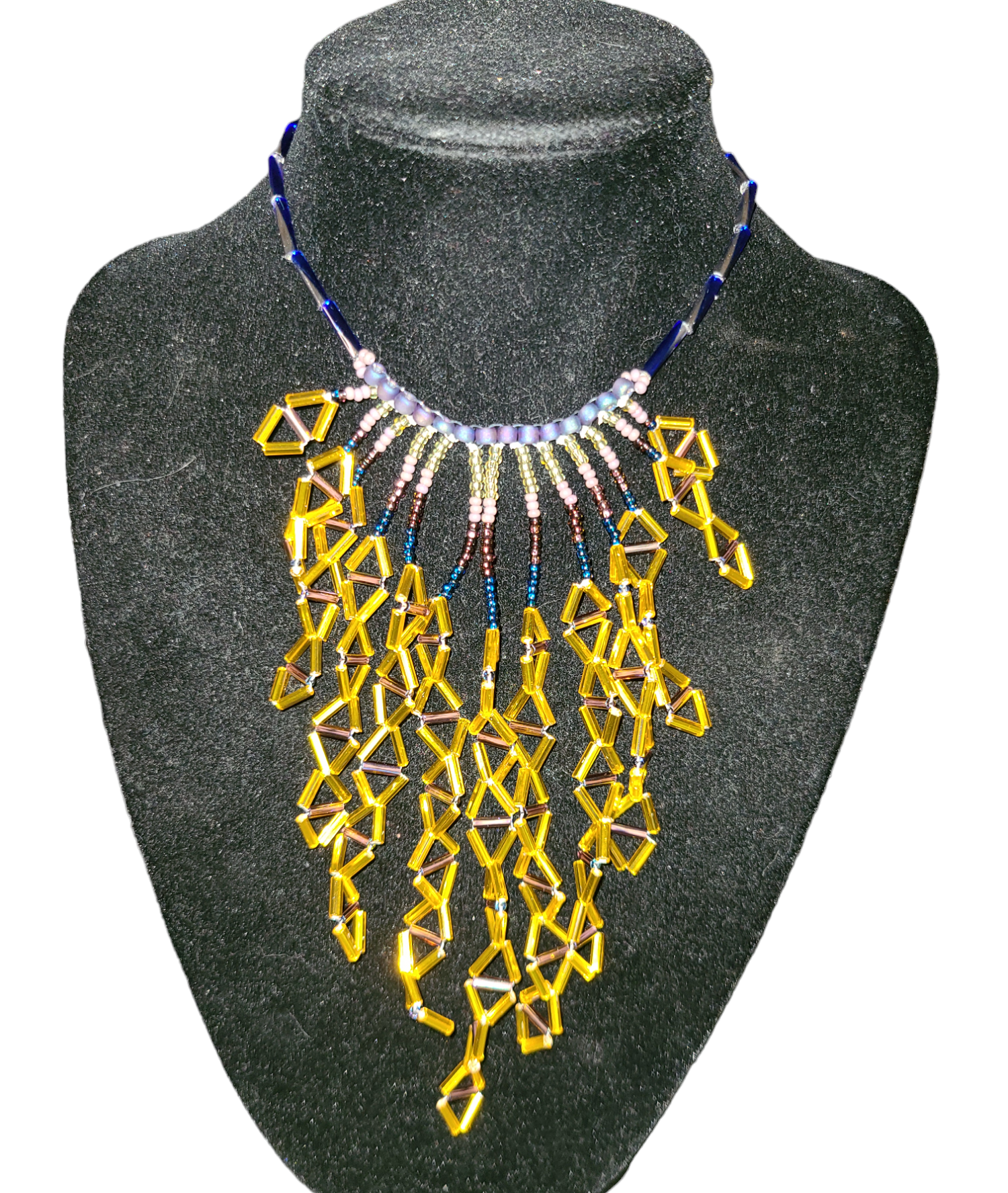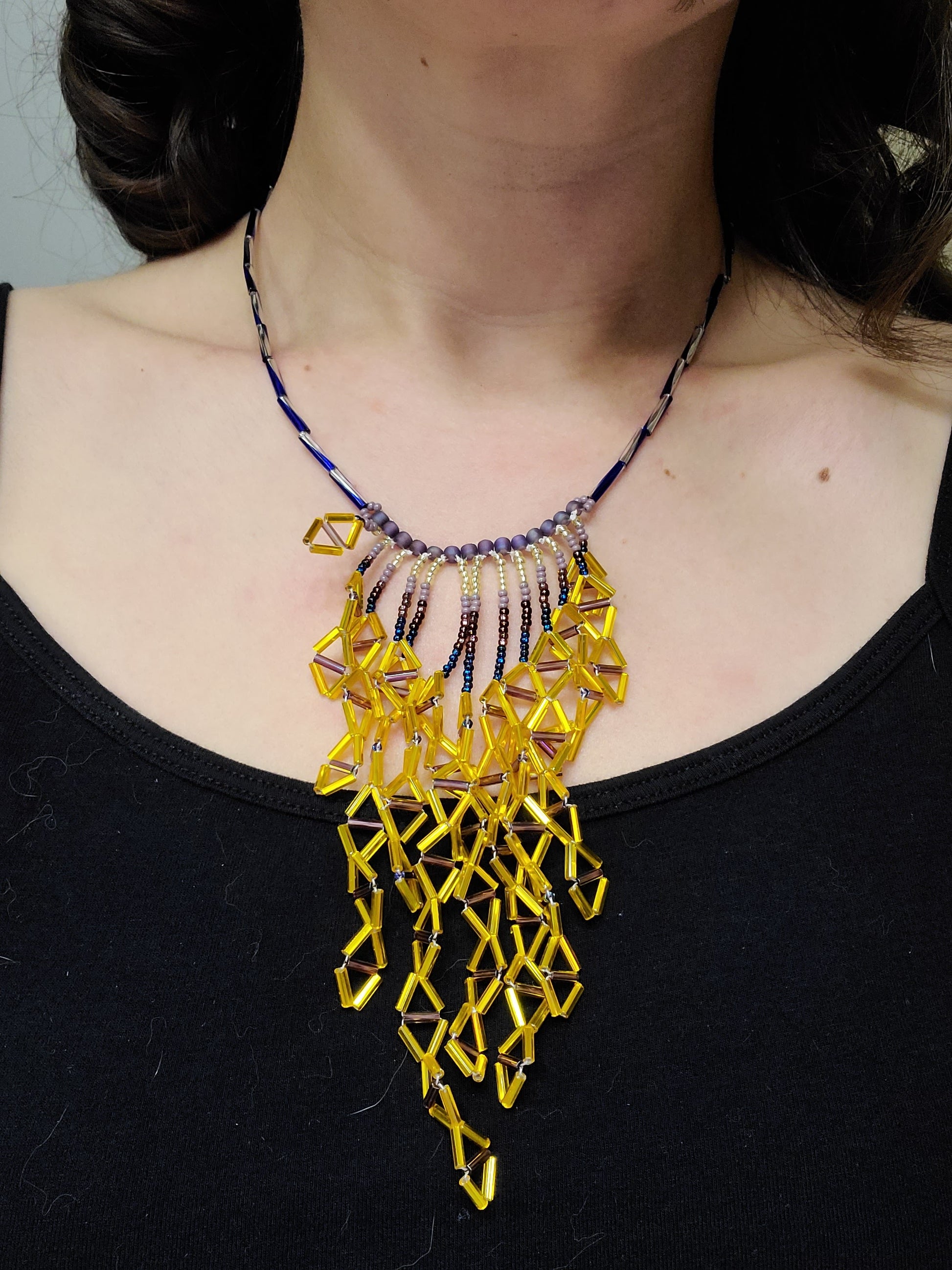 Step into elegance with the Regal Purple and Gold Triangle Waterfall Necklace. Bold geometric patterns cascade in a waterfall design, combining rich purples and golden tones for a striking, regal effect. Lightweight yet impactful, this necklace makes a statement at galas, dinners, or wherever you choose to shine.