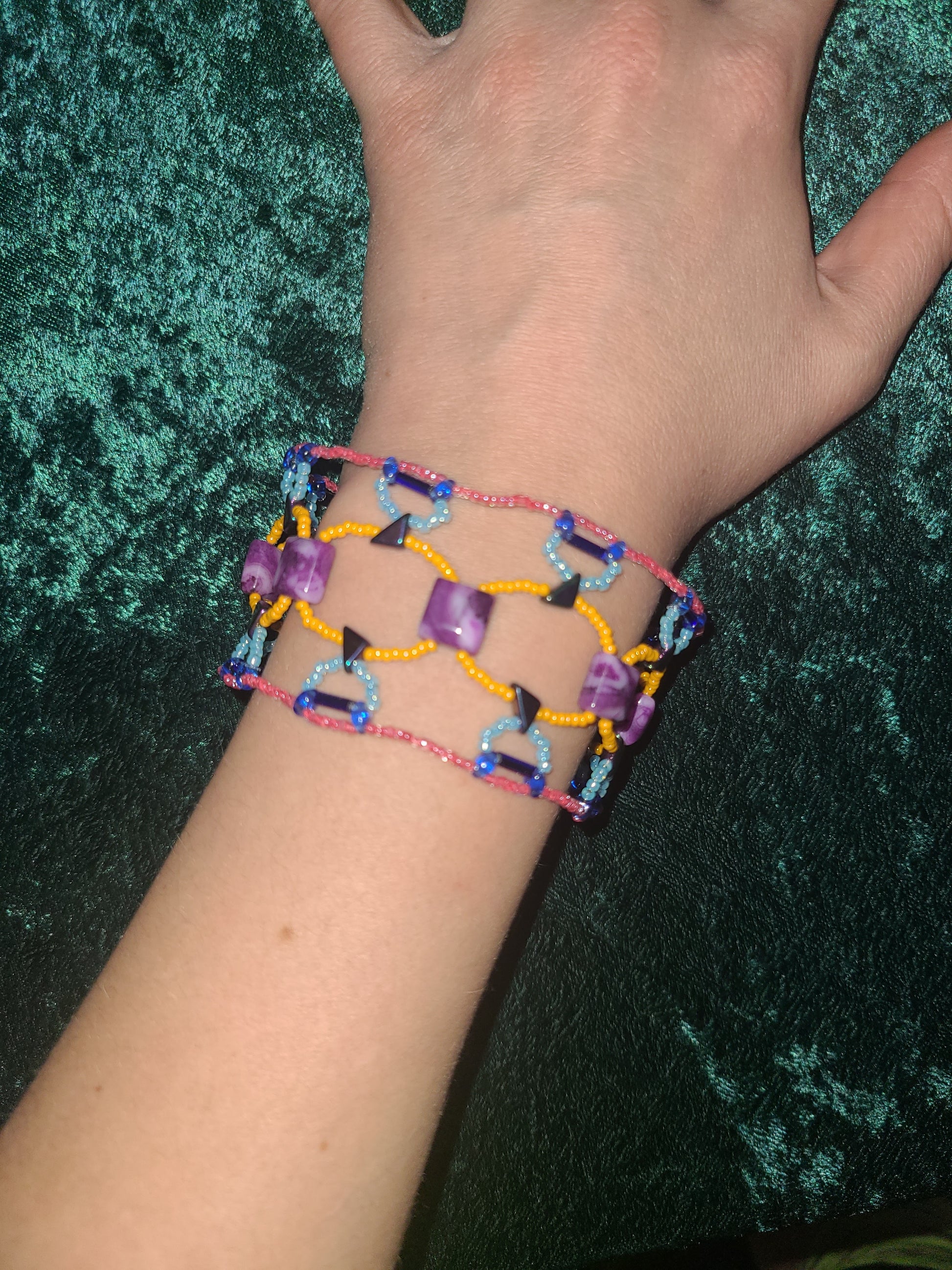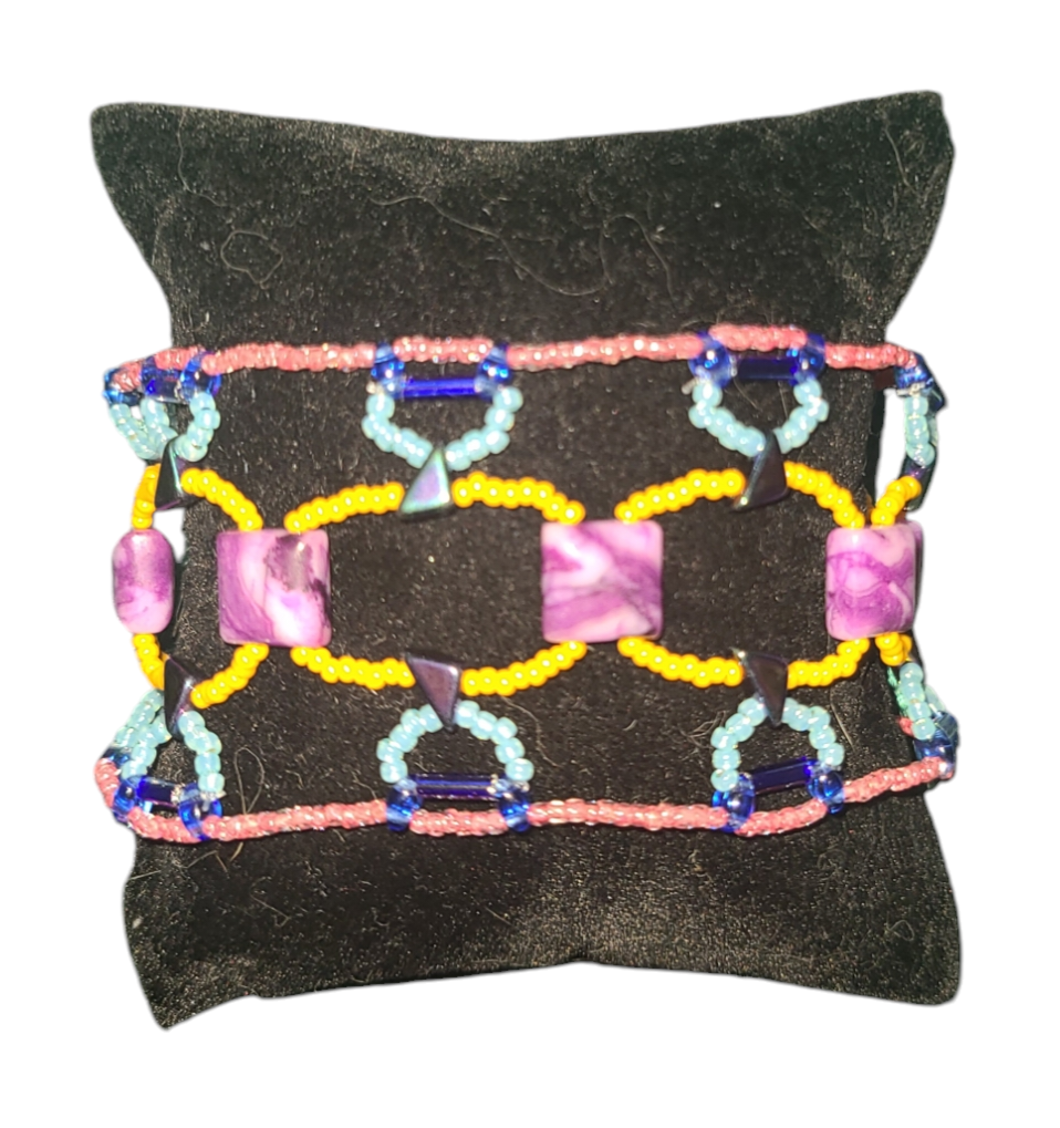 The swirling patterns of purple crazy lace agate stones take center stage in this colorful bracelet, accented by vibrant yellow, blue, and pink details that add a playful energy to the piece. Perfect for creative, bohemian-inspired outfits, this bracelet shines when paired with flowing skirts, printed tunics, or a maxi dress for festivals or casual gatherings. For a modern twist, wear it with an all-black ensemble to let its bold colors pop. This bracelet is ideal for free-spirited women who appreciate statement-making, artistic designs.