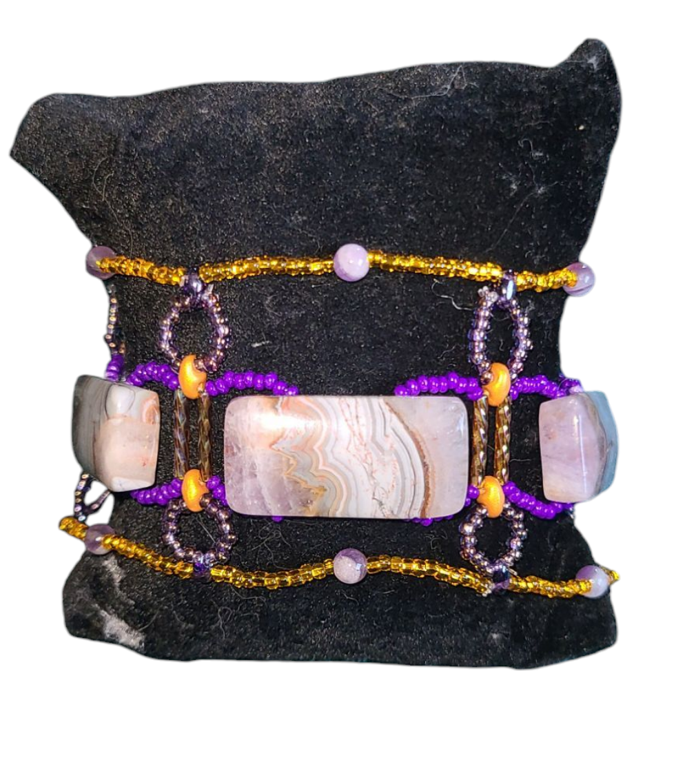 This structured cuff-style bracelet features rainbow amethyst slabs framed by a delicate lattice of golden and purple seed beads. The architectural design is reinforced with small amethyst rounds, creating a striking contrast against the bold centerpiece stones. The interplay of gold and purple adds a regal touch, making this bracelet perfect for adding a refined, artistic element to your outfit. Pair it with a deep plum blouse and tailored trousers for a gallery opening or a dinner date.
