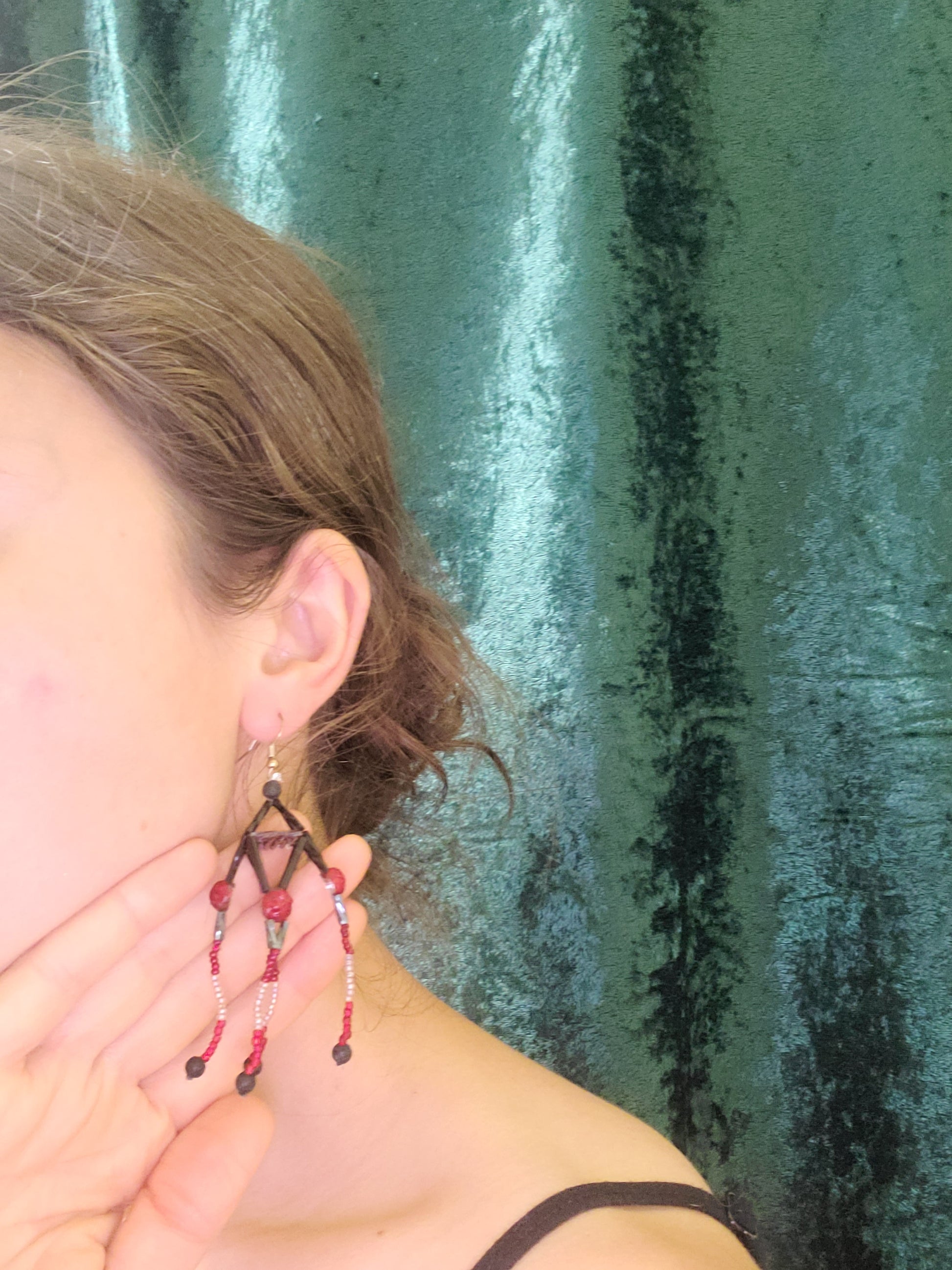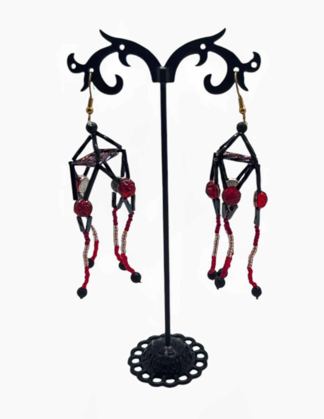 This earring design is evocative of the striking pagodas, or multi-tiered towers in southeast Asia. This particular pair features a bold red and black color palette with striking red cabochons, with basalt lava beads at the top and along the base of each dangle.