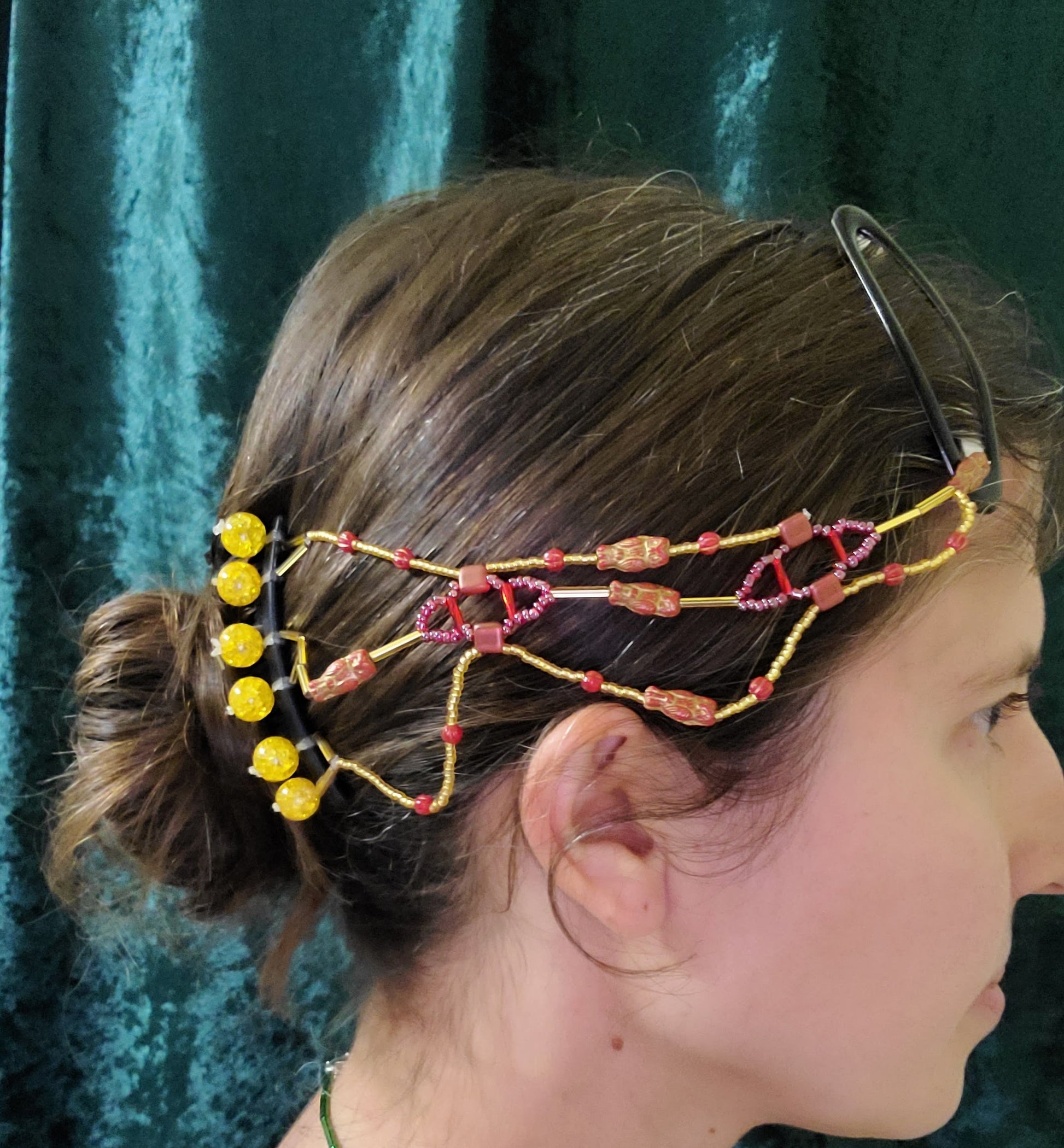 This hair jewelry features a comb with gold crackled agate beads and intricate beadwork accented by glass owl beads in a warm color palette.