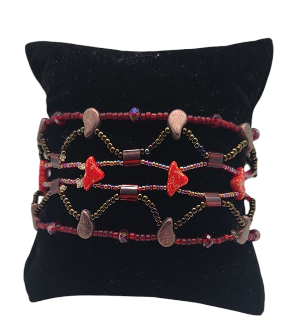 Earthy yet vibrant, this bracelet combines rich plum tones with vivid red accents in a mosaic-inspired lattice design. Organic shapes and textured elements give it a Bohemian charm, making it a standout piece for creative souls. Wear it with an oversized cardigan and ankle boots for a cozy, artsy outfit, or pair it with a maxi dress for a free-spirited festival vibe. A versatile statement piece that exudes individuality.