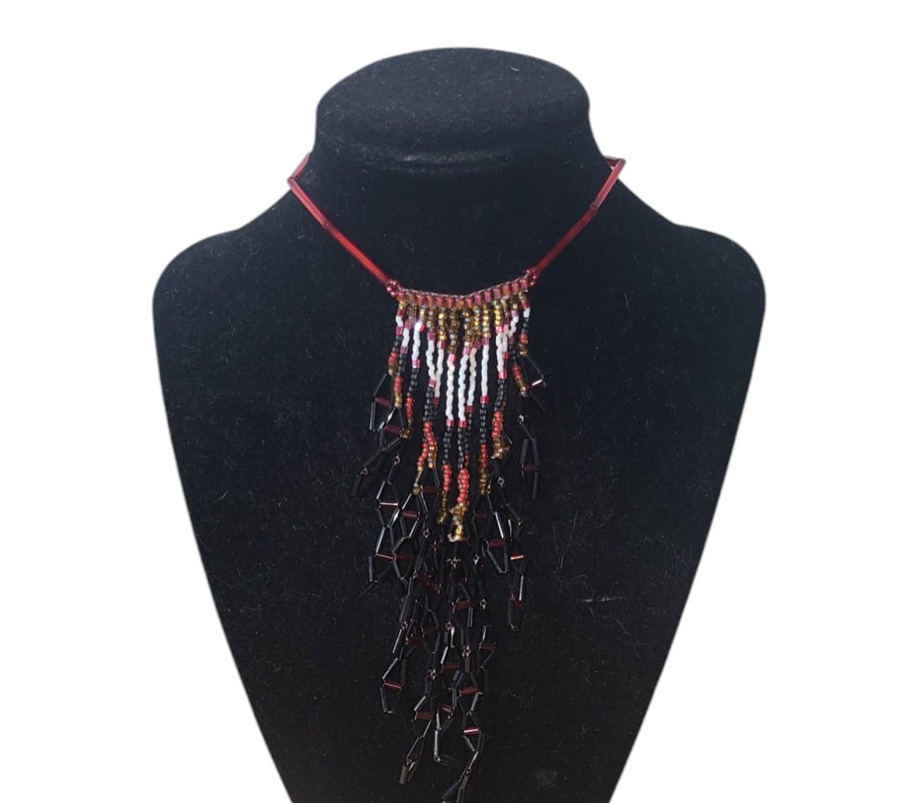 This dramatic necklace features cascading triangular beadwork in striking red, black, and gold tones, evoking the motion of a waterfall. The layered fringe design adds texture and movement, making it a standout accessory for bold fashion statements. Pair with a strapless dress or sleek blazer for a night out or a formal event.