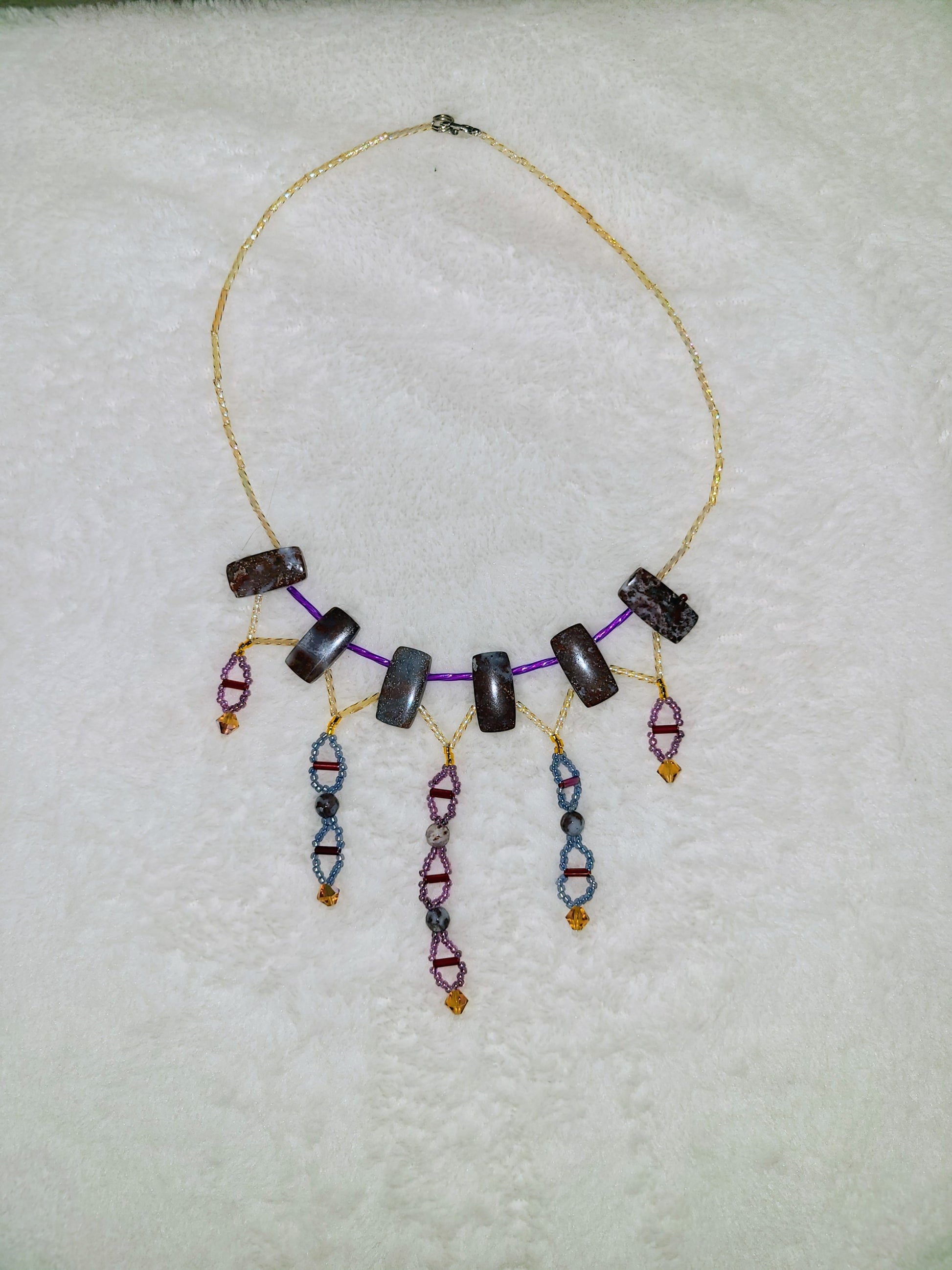 This striking necklace takes inspiration from the drama of ancient Delphi, featuring bold red lightning agate stones with natural streaks of deep crimson and burnt orange. The elongated agate stones are framed by intricate beadwork in warm amber, deep wine, and metallic bronze tones, creating a rich, layered effect. Below, a cascading arrangement of linked beads forms a dynamic, twisting silhouette that mimics the fluid motion of a helix, adding movement and depth to the design.