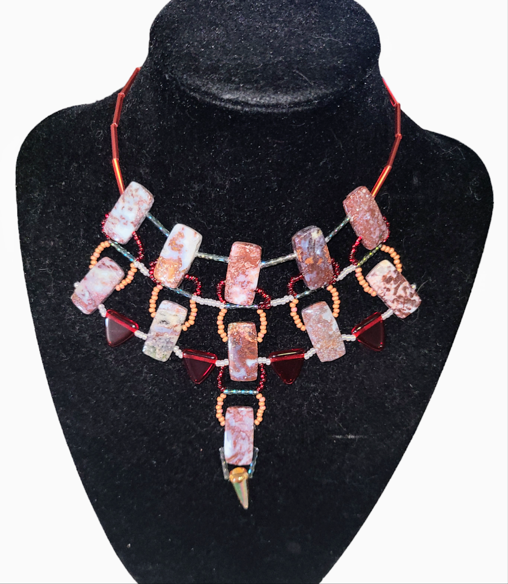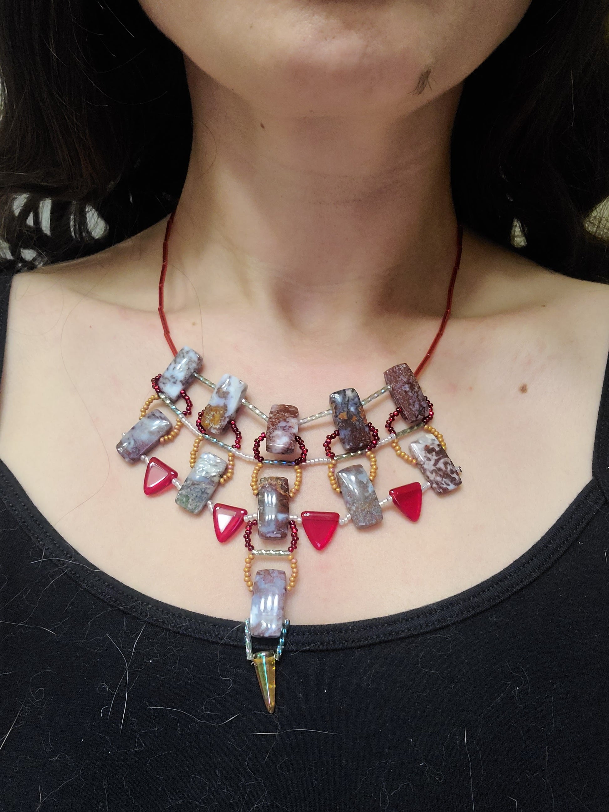 This layered necklace features rectangular red lightning agate beads framed by warm gold, red, and orange beadwork. The triangular shapes and balanced design draw from Moroccan metalwork, giving it a strong, structured look.