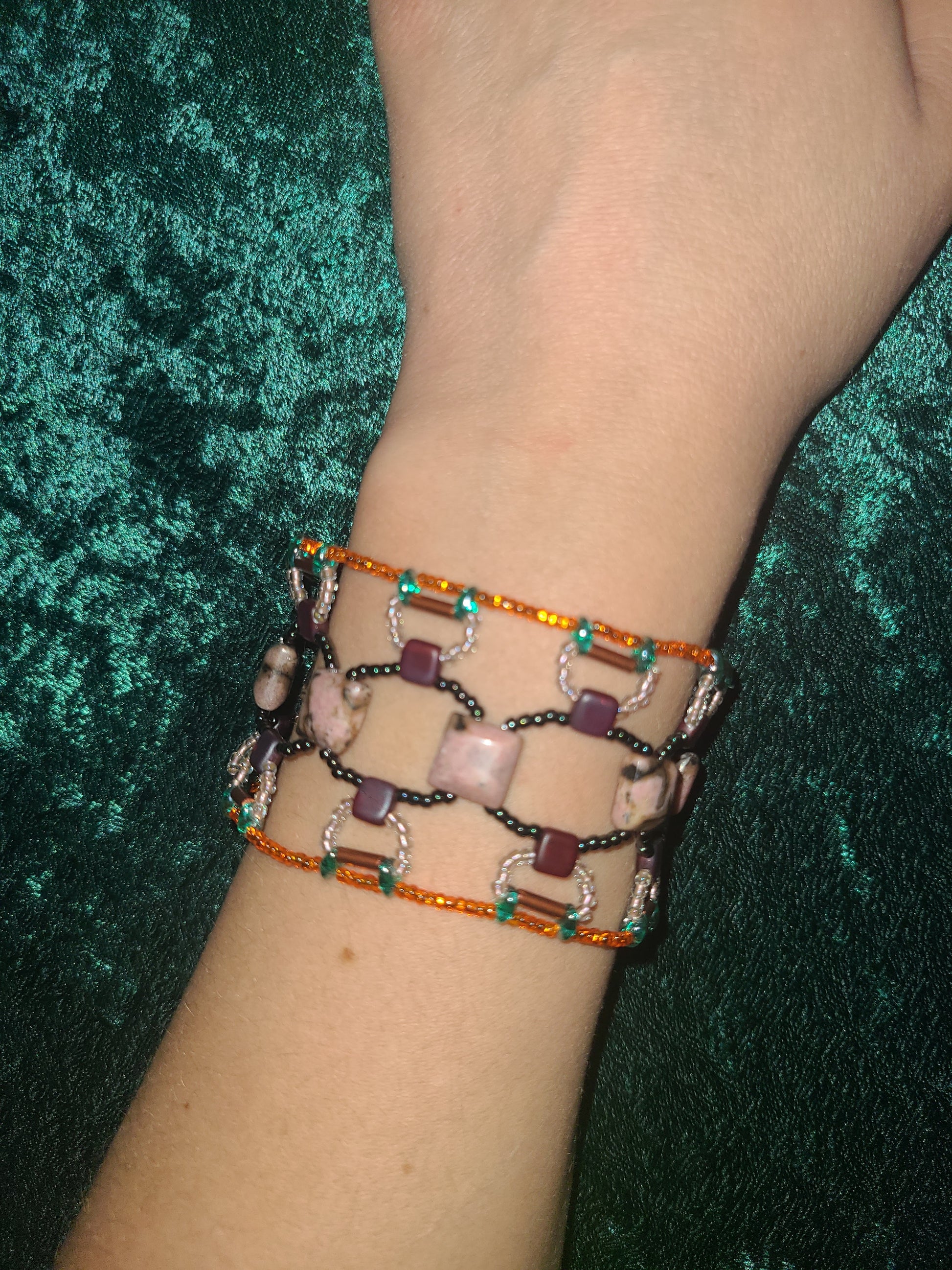 This bracelet features soft pink rhodonite stones, each with subtle marbling that gives them an organic, natural appeal. Earthy taupe and autumn orange accents create a harmonious balance, while the intricate pattern adds texture and visual interest. The muted tones make it an effortless addition to both casual and professional outfits. Pair it with a tailored cream blazer and wide-leg trousers for a polished office look or a linen maxi dress and leather sandals for a relaxed weekend brunch. Its timeless design is perfect for women who appreciate understated elegance in their accessories.