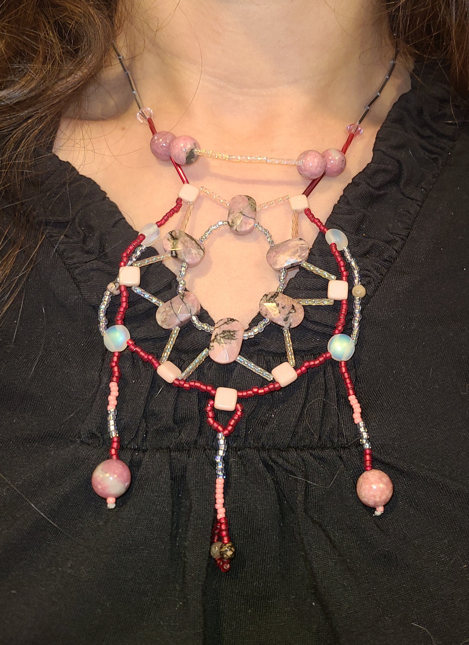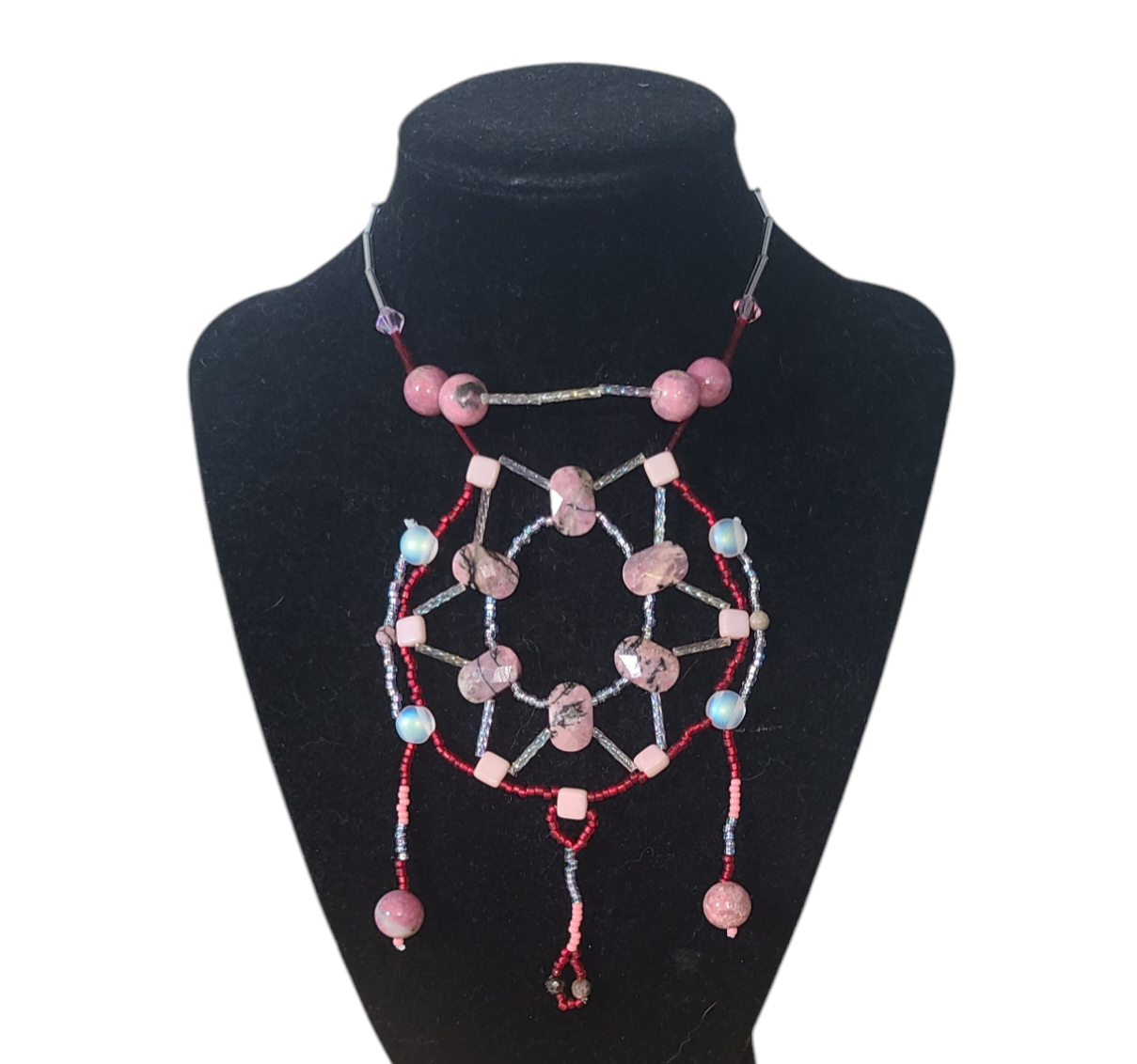 This striking necklace showcases an intricate Celtic knot pattern with polished rhodonite beads in soft pink tones. Accents of gray beads and smaller seed beads add contrast, while the draped structure creates a cascading effect. The piece ends with dangling strands of glass and rhodonite beads for added movement, making it a true statement for bold, eclectic style lovers. Ideal for pairing with bohemian-style dresses or adding flair to casual wear. Perfect for brunches, outdoor events, or art markets.