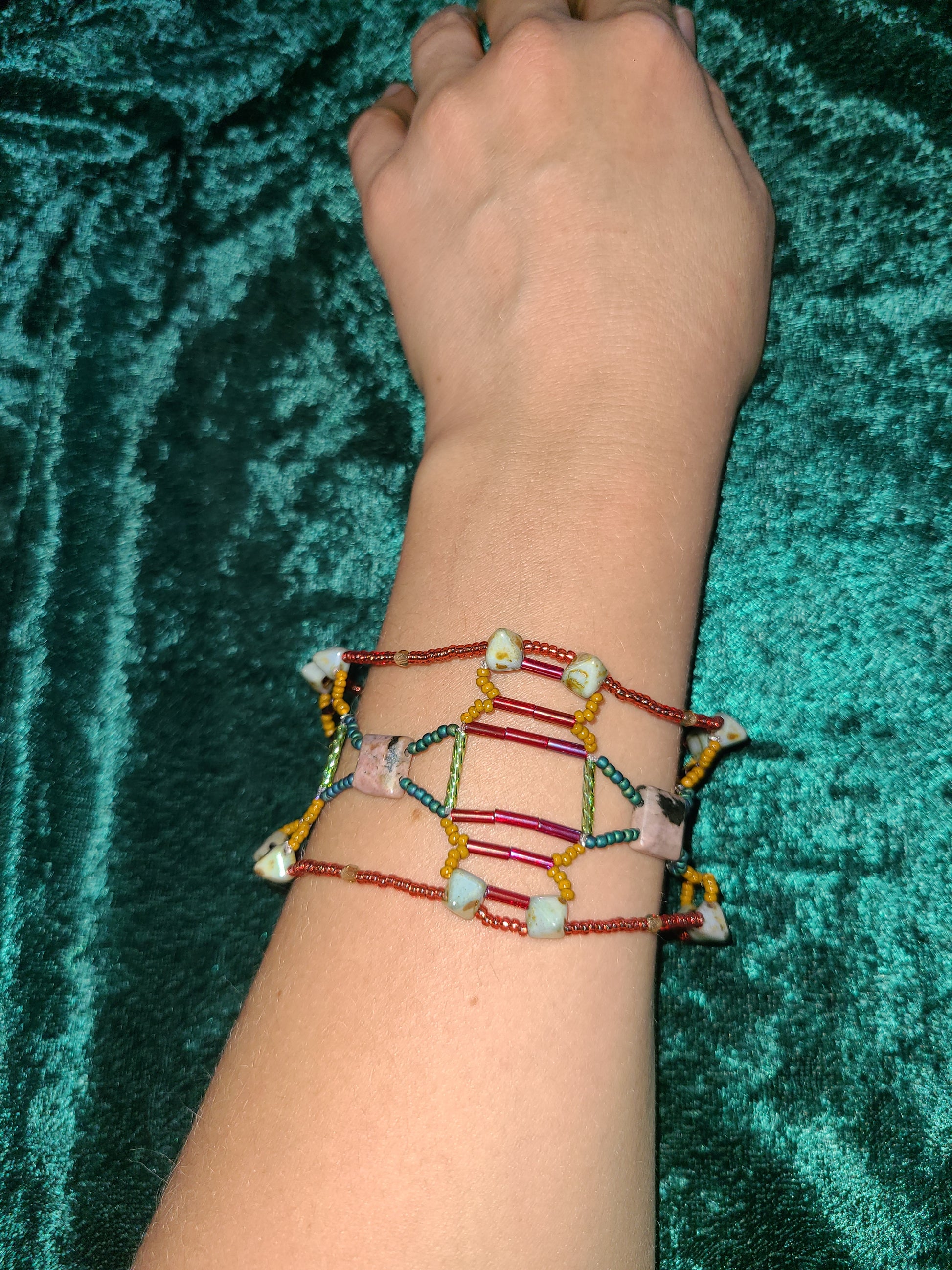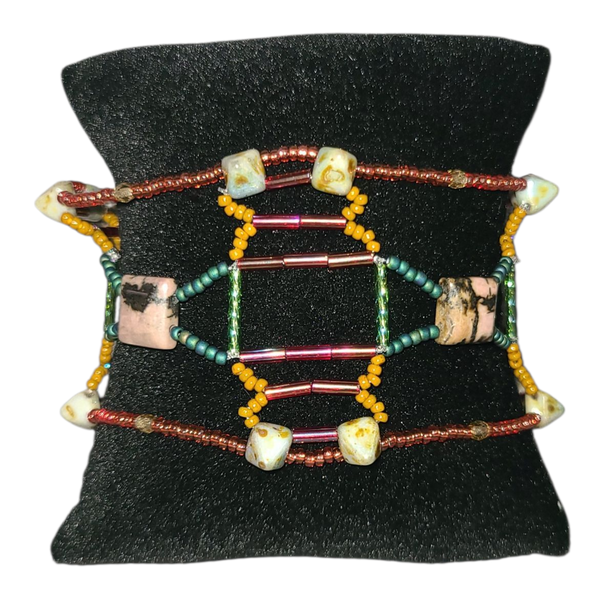 Alternating rectangular and diamond-shaped beadwork frames pink rhodonite squares, with a green-and-red central beaded panel for contrast. This statement bracelet would work well with an earth-toned spring dress.