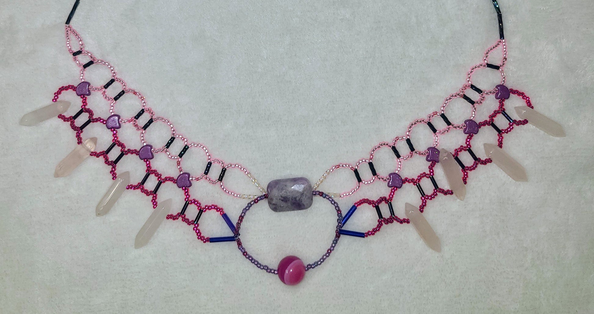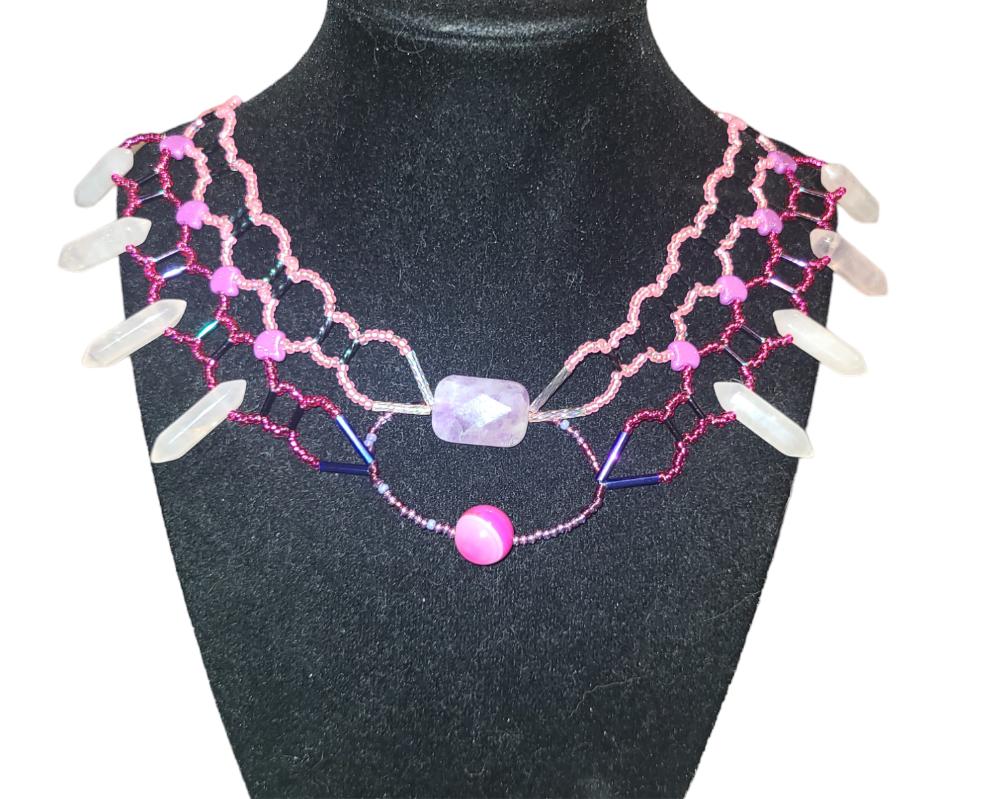 This structured collar necklace, inspired by ancient Egyptian jewelry, features central agate and amethyst stone, with a collar of polished rose quartz and intricate double ladder beadwork. The soft pink and lavender tones, accented with hints of green, create a bold yet elegant design. This piece complements professional attire, like a tailored dress, or adds a touch of sophistication to casual outfits. Ideal for work events, gallery openings, or an upscale brunch.