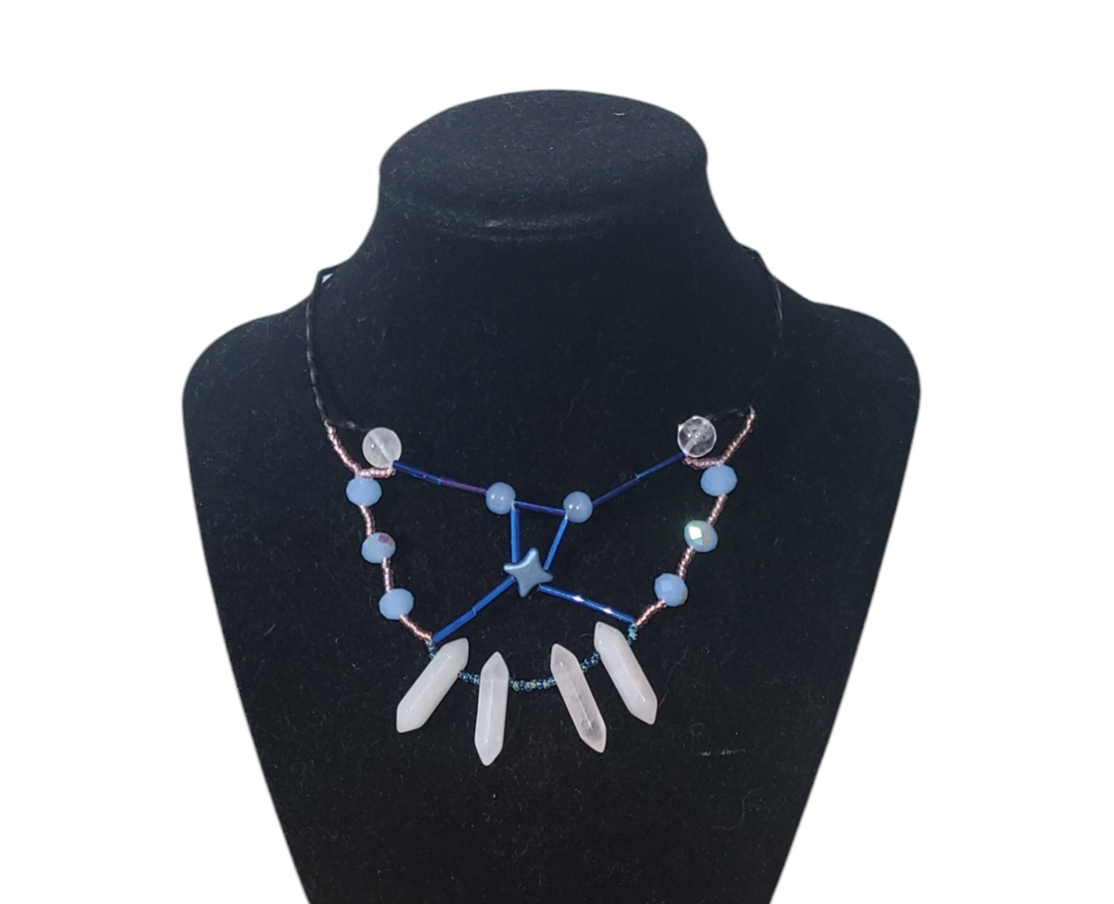 Delicate and symmetrical, this necklace combines soft pink rose quartz stones with vibrant blue beadwork in a butterfly-inspired design. Dangling quartz spikes add a dynamic touch, evoking movement and grace. Perfect for adding a pop of color to a summer dress or enhancing a casual blouse and jeans ensemble. Ideal for garden parties, brunches, or creative events.