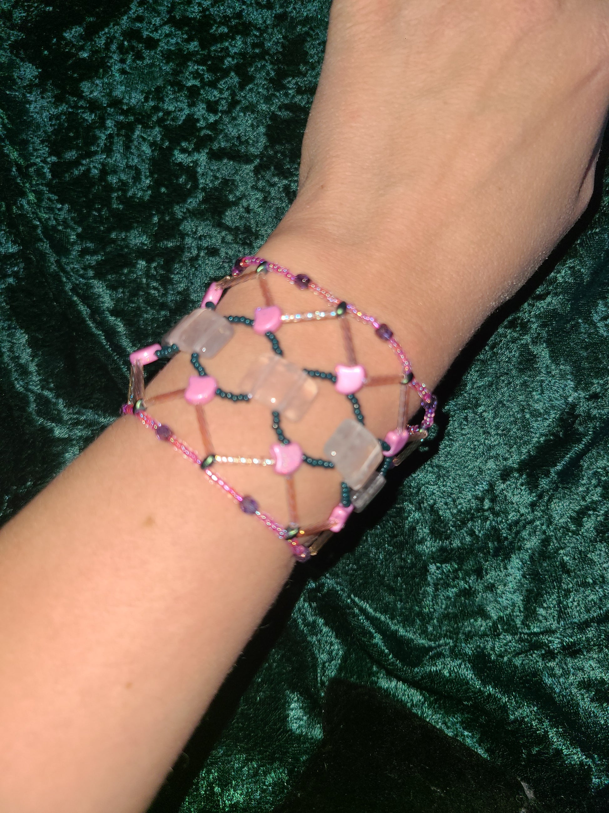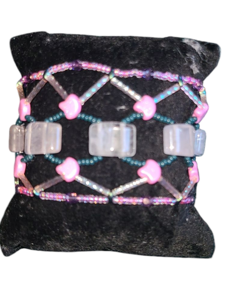 Soft yet structured, this bracelet showcases translucent rose quartz slabs interwoven with pink and silver beads in a diamond-grid pattern. The gentle pastel hues contrast with the precise, geometric design, giving it an elegant yet modern feel. This piece pairs beautifully with a cream blouse and a soft pink scarf, making it perfect for a romantic dinner or a springtime garden party.