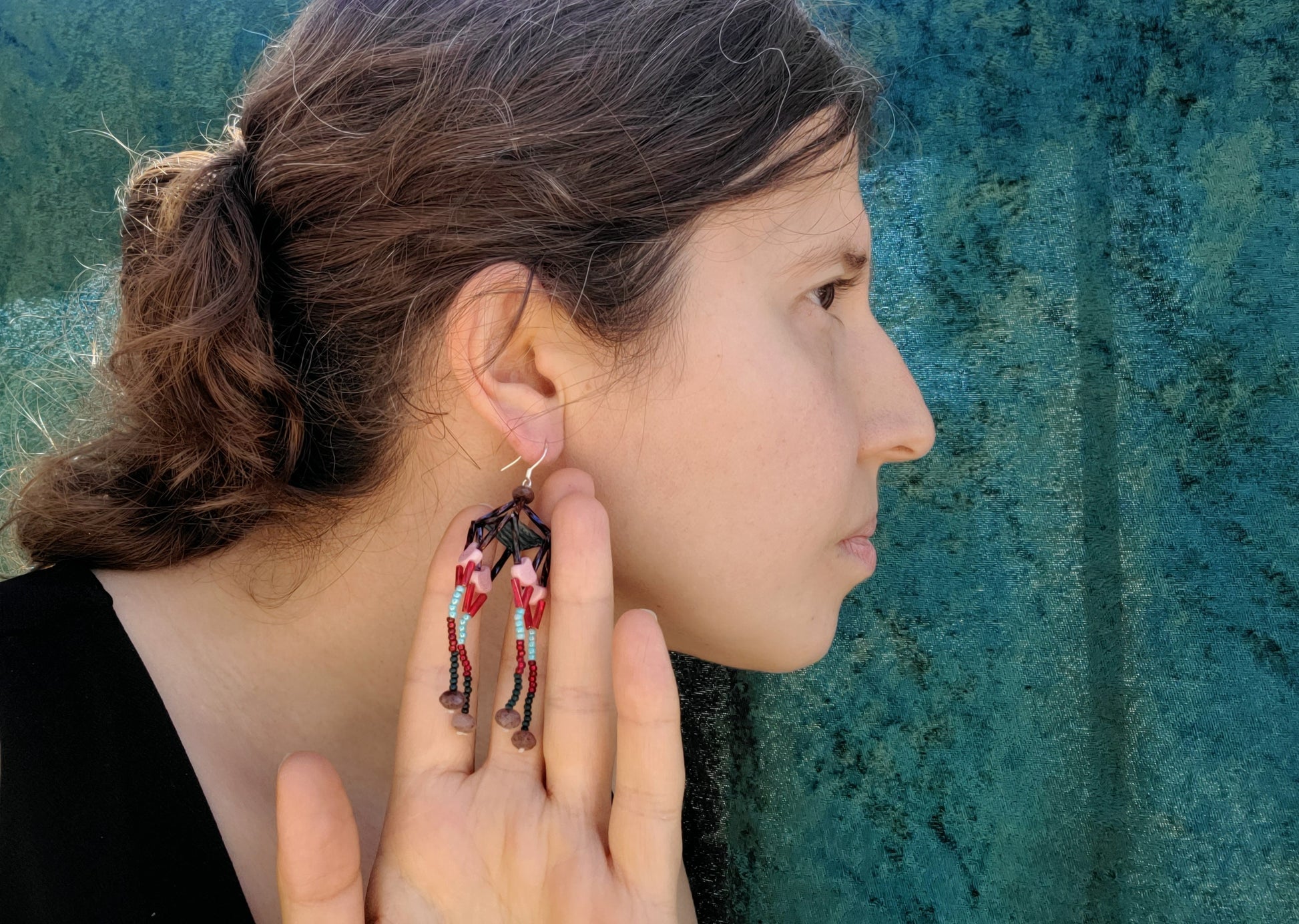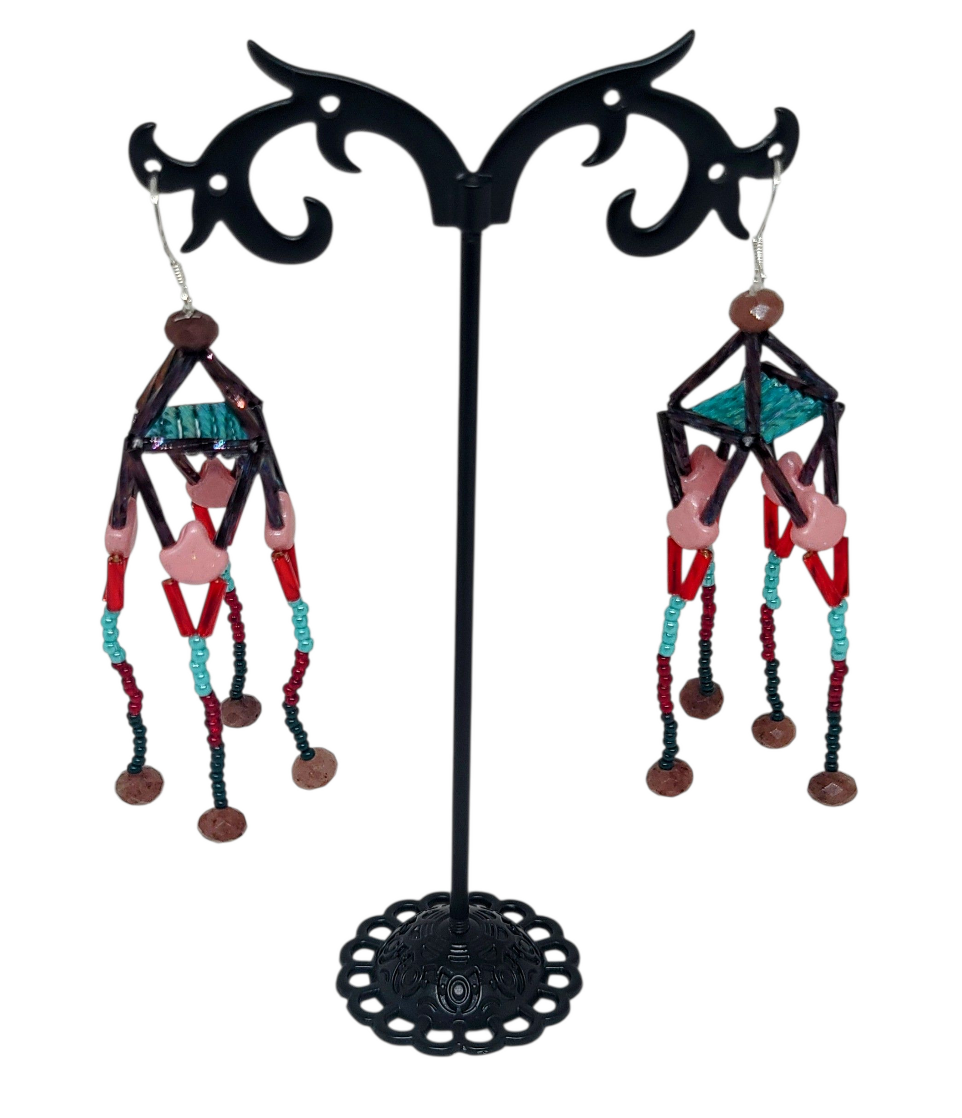 Faceted ruby stones and pink glass beads form a tiered pagoda shape, with red, teal, and burgundy beadwork cascading from the base. The contrast between the dark framing and the soft inner colors gives these earrings weight without bulk. Pair them with a black linen jumpsuit or a magenta blouse and wide-leg trousers—perfect for a dinner out or an evening event where color and shape speak for themselves.