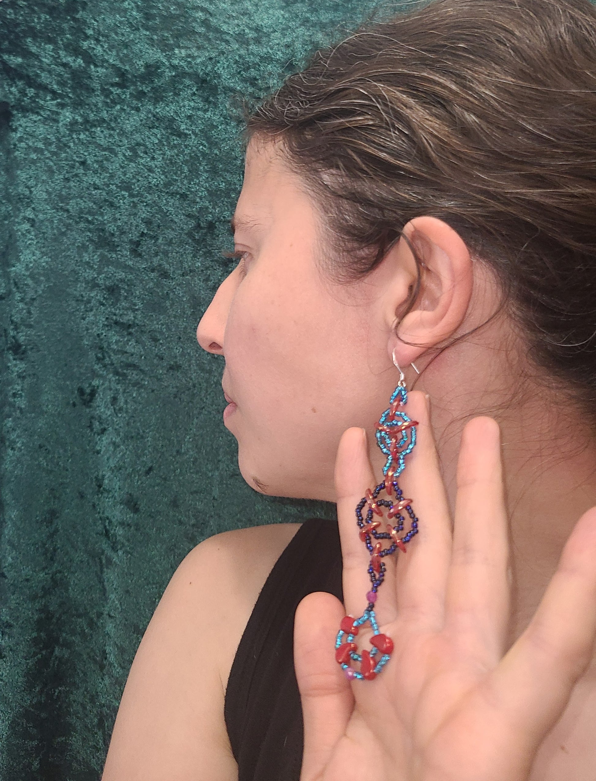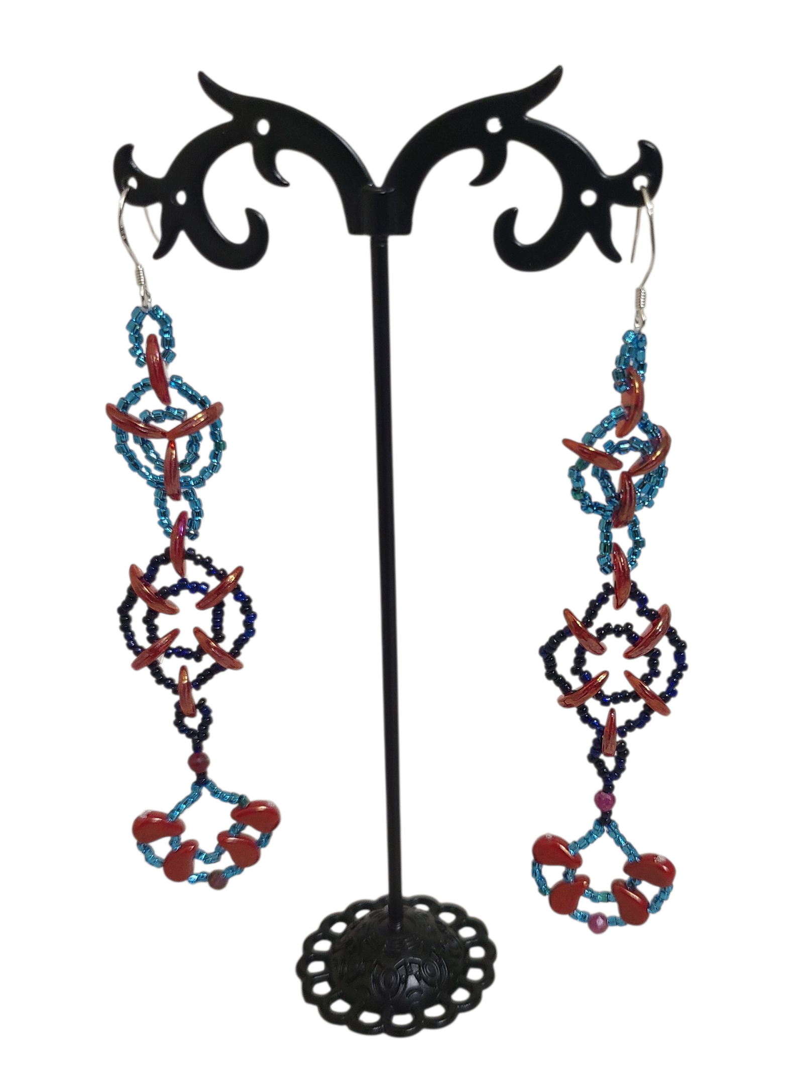 These long statement earrings feature a tiered, geometric with intricate beadwork and sapphire rubies. Interlocking circular sections create a bold, architectural silhouette that moves easily with wear. With their length and structure, they’re perfect for adding a wow factor to a simple black dress or elevating a casual blouse and jeans.