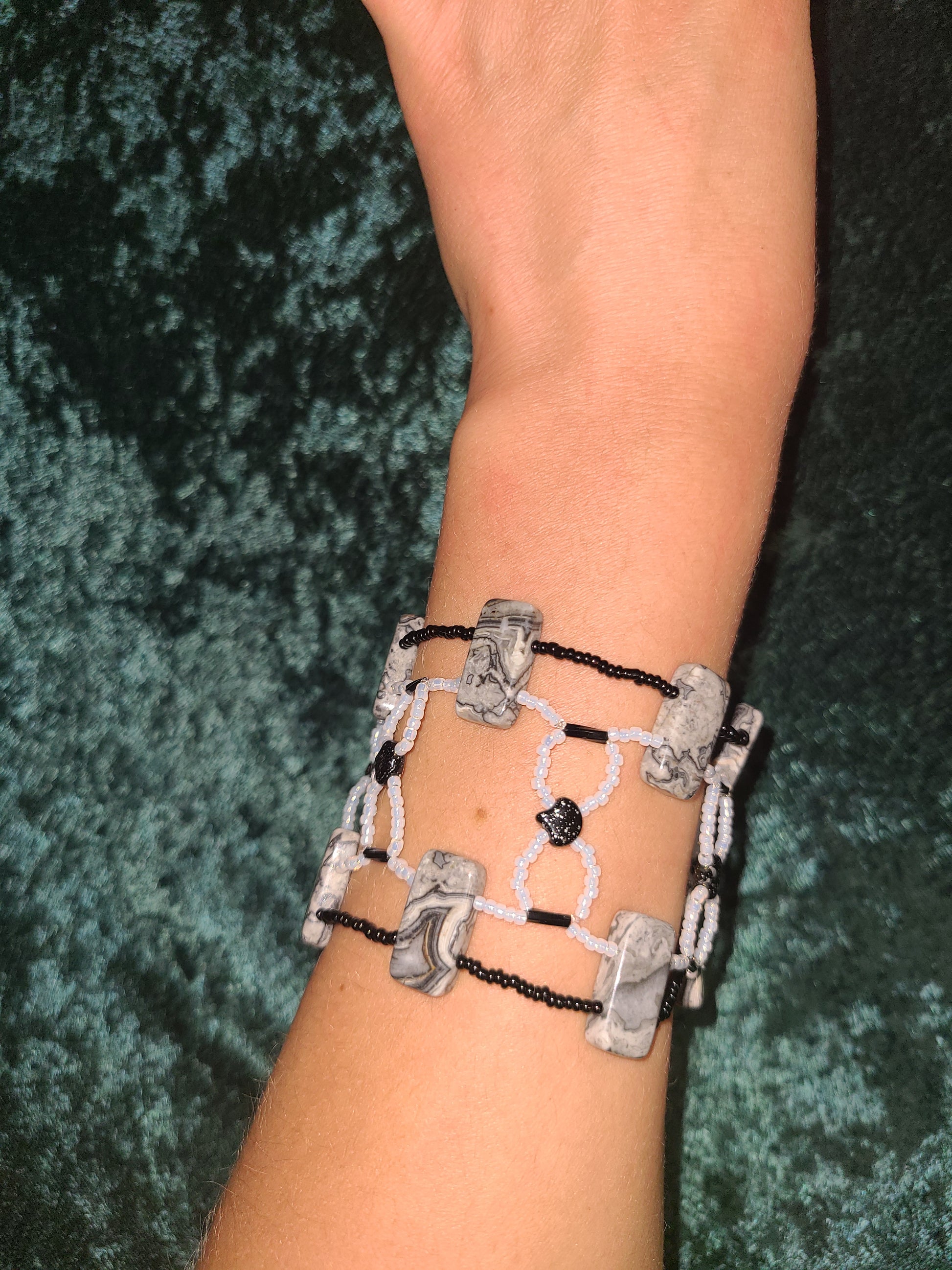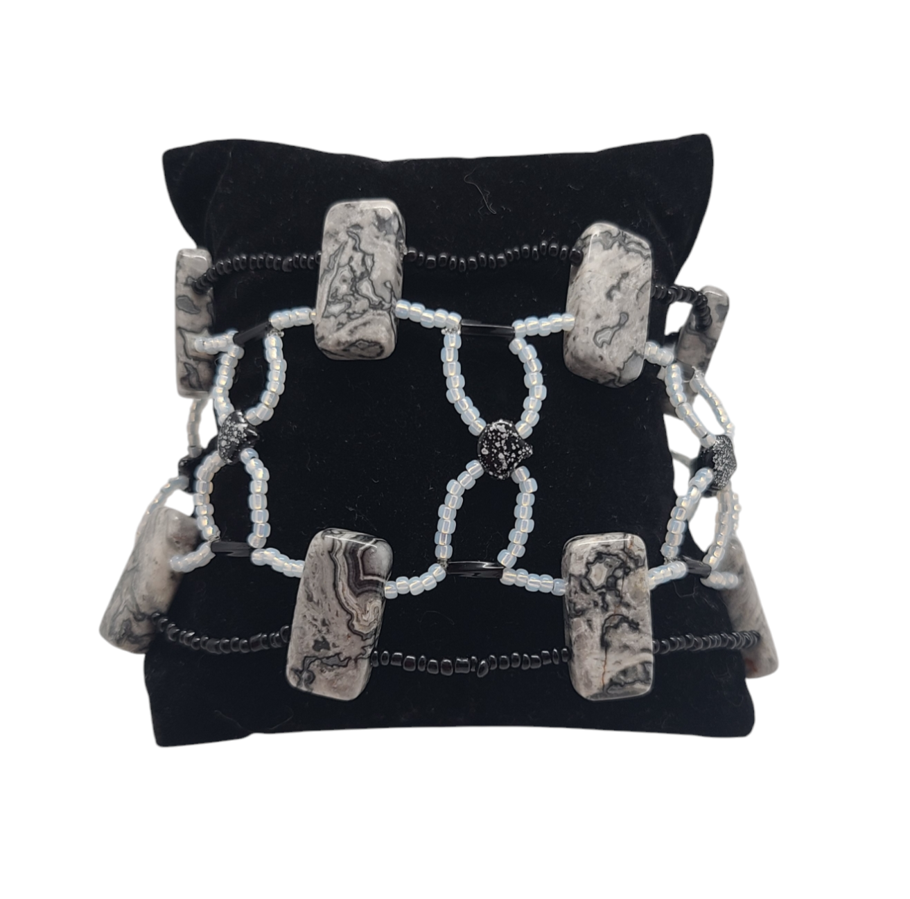 Polished silver crazy lace agate stones steal the spotlight in this monochrome masterpiece. The swirling patterns of black and white create a dramatic contrast against silver beads, while the geometric design adds modern sophistication. Wear this bracelet to lend a sleek finish to a tailored pantsuit or pair it with a flowing black dress for a gallery opening or evening out. Its versatile elegance makes it a standout piece in any jewelry collection.