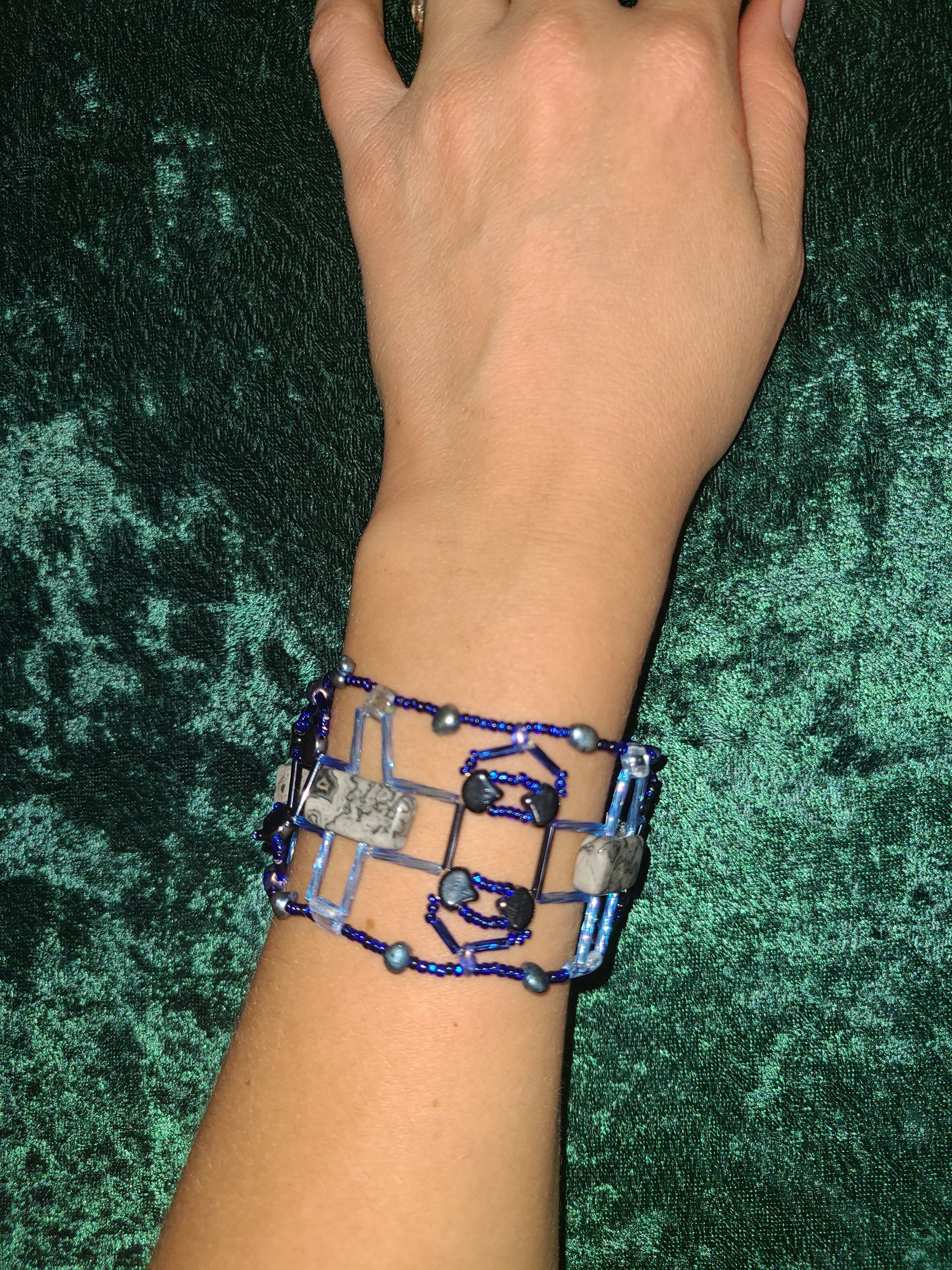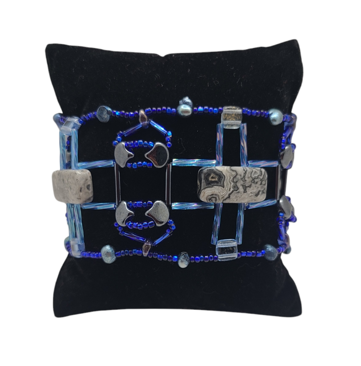 This striking bracelet features a series of geometric shapes and silver craz lace agates with glass beads in various blue hues. Each end is studded with blue-gray freshwater pearls.