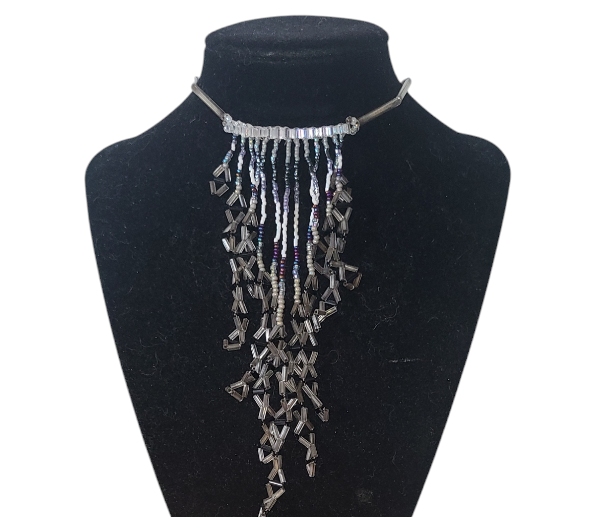 A dramatic cascade of metallic gray and deep purple fringe beadwork forms a shimmering waterfall effect in this bold necklace. Geometric accents add structure, creating a striking contrast with the fluid fringe design. Perfect for cocktail parties or evening outings, it pairs beautifully with a sleek black dress or tailored blazer.