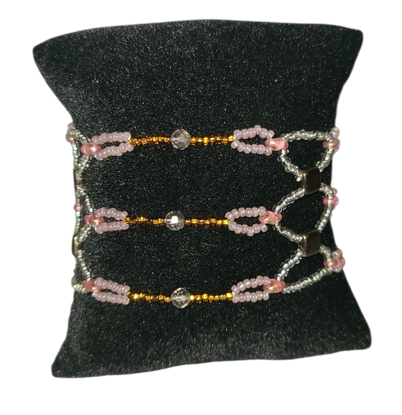This intricate yet delicate beaded bracelet blends smoky quartz beads with silver, blush, and amber-toned beadwork for a subtle sparkle. The slim, open ircle lattice design makes it comfortable for all-day wear. This bracelet would work well with a flowy maxi dress for an outdoor wedding or layered with silver bangles for a chic office-to-evening transition.