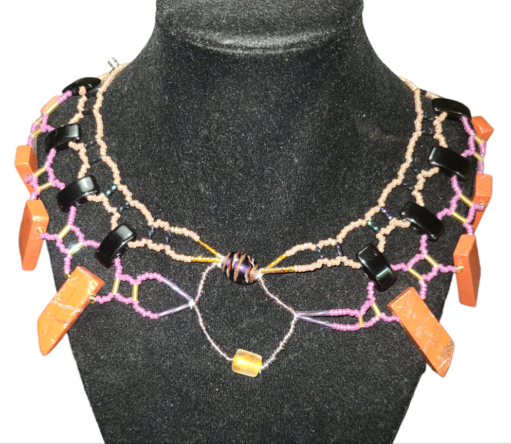 This bold bib necklace design was inspired by the ornate necklaces of ancient Egypt. This particular necklace features detailed tan and pink beadwork, with purple and tan glass beads at the center and jet black beads in the middle of the necklace. Accents of gray give this a sultry, smoky feel. The base is adorned with large red jasper beads.
