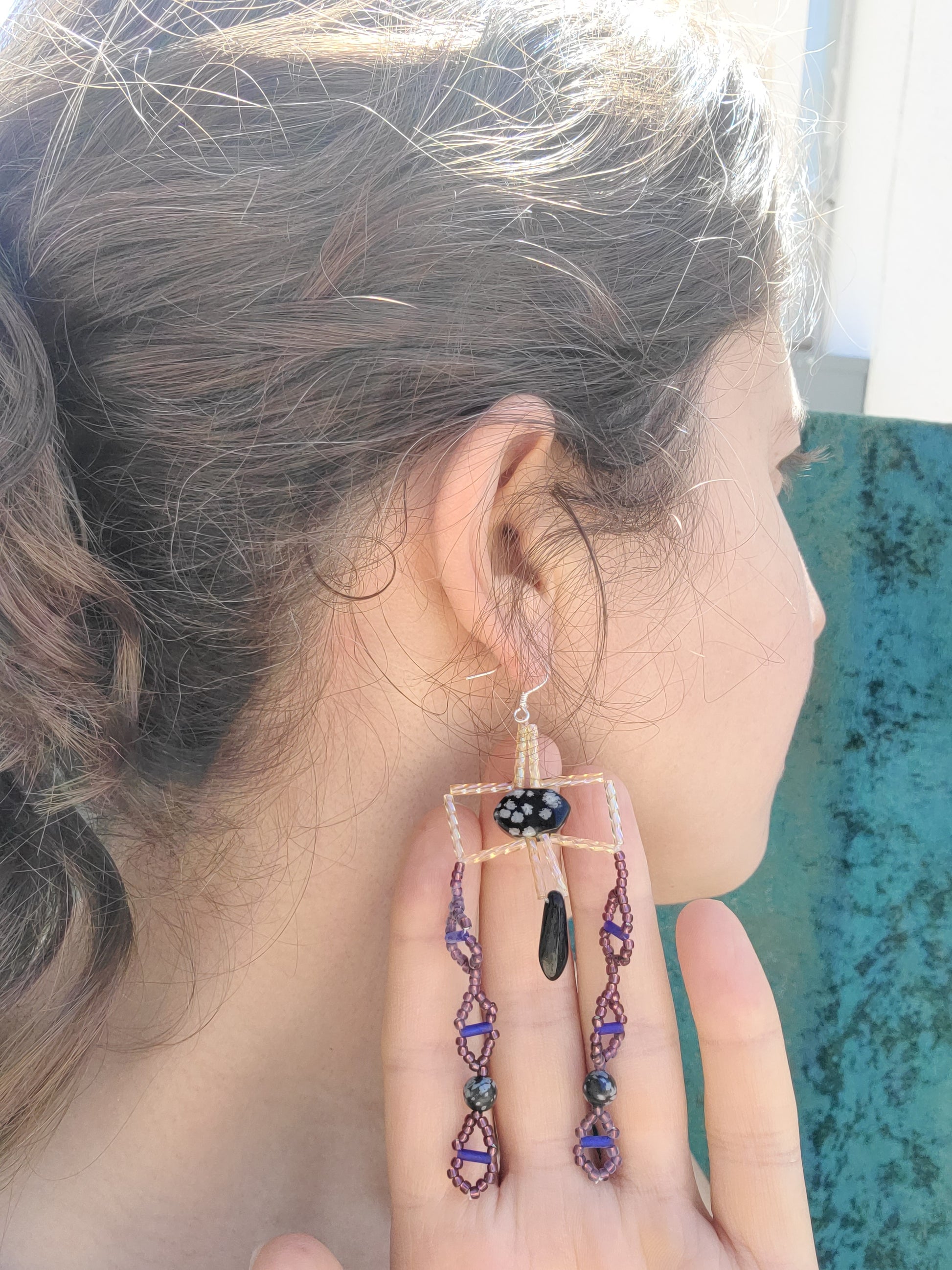 A matte gold cross shaped design frames snowflake obsidian cabochons at the center, flanked by plum-colored beadwork and a black central teardrop. The design plays with shape and shadow, giving these geometric drop earrings a clean, sculptural feel.
