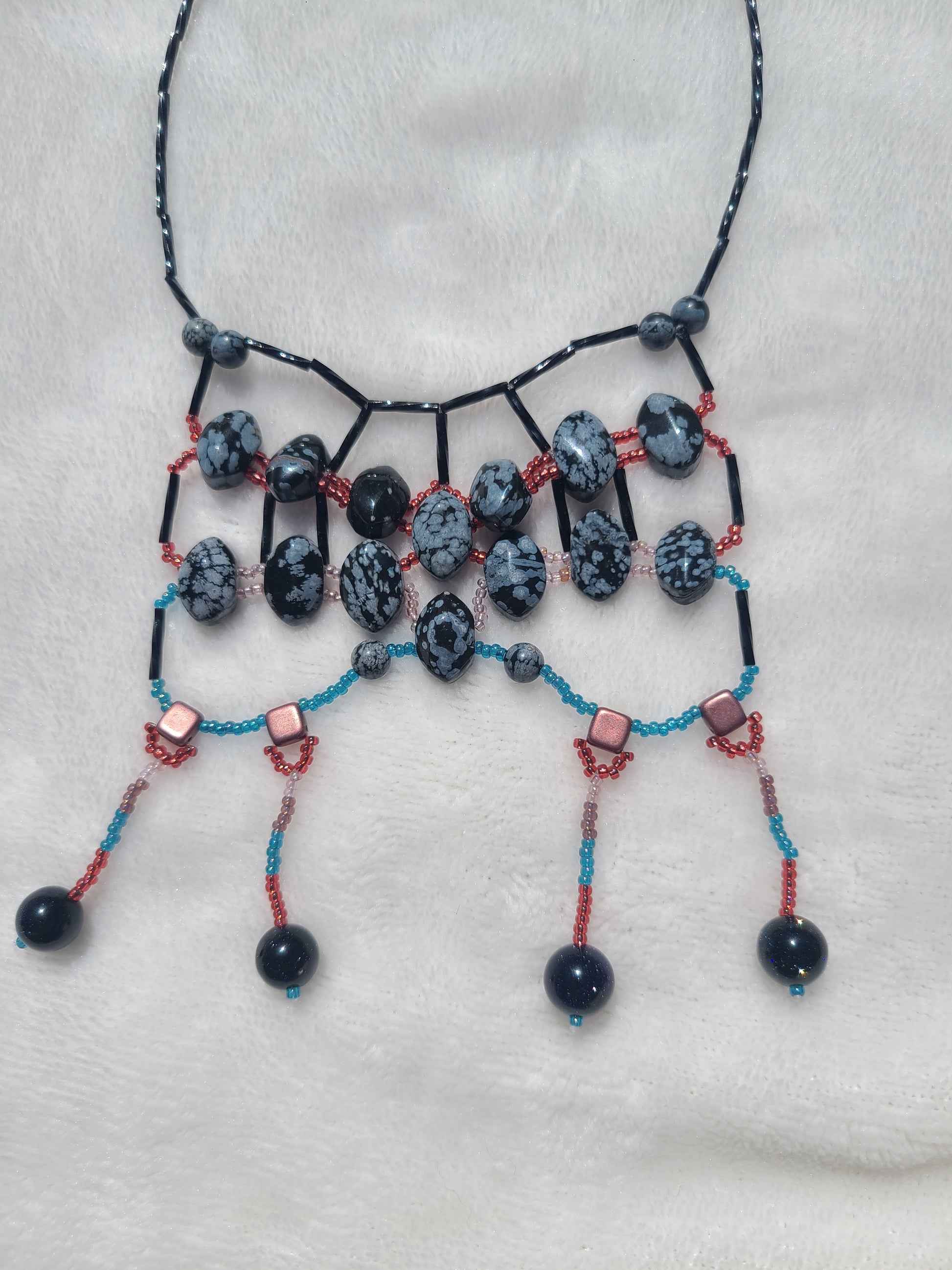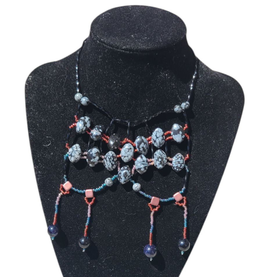 This striking monochrome piece features rows of snowflake obsidian rounds set against a black and muted red beaded frame. The layout is orderly and architectural, with four short fringe drops adding a subtle shift in proportion. The gray-and-black speckled stones add texture without overpowering the look. Wear it with sharp tailoring, like a black blazer or a minimalist wrap dress—it’s a confident piece for speaking engagements or gallery nights.