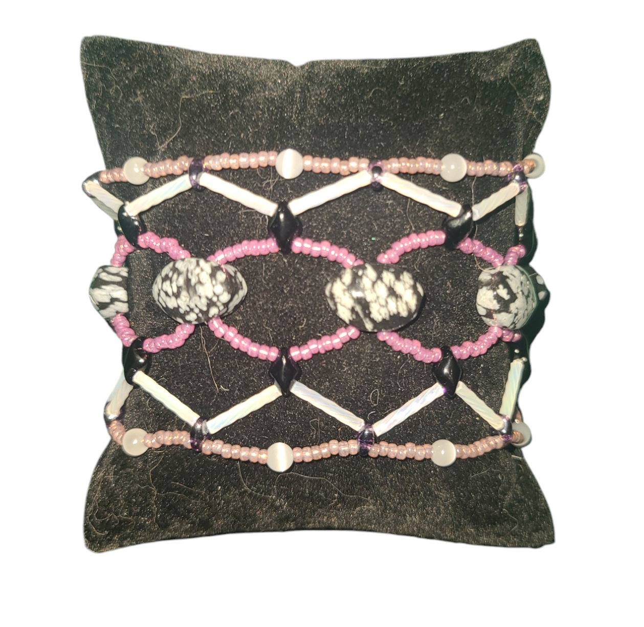 This striking bracelet highlights natural snowflake obsidian stones, accented with soft pink and black beading in a dynamic lattice design. The monochromatic palette and thoughtful detailing make it a versatile accessory for minimalist or modern wardrobes. Pair this obsidian bracelet with a tailored blazer for work or a cozy knit sweater for casual outings. Ideal for workdays, relaxed brunches, or any occasion where subtle sophistication is desired.