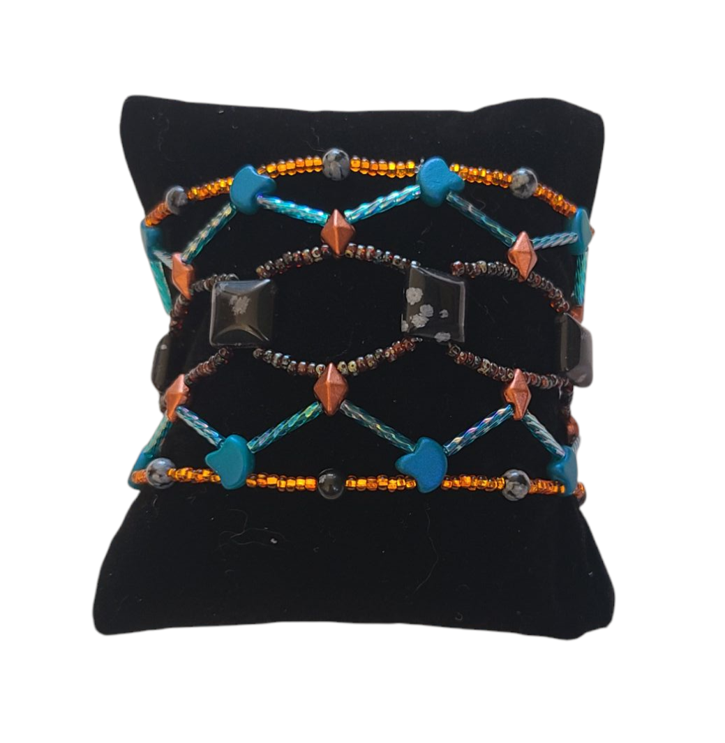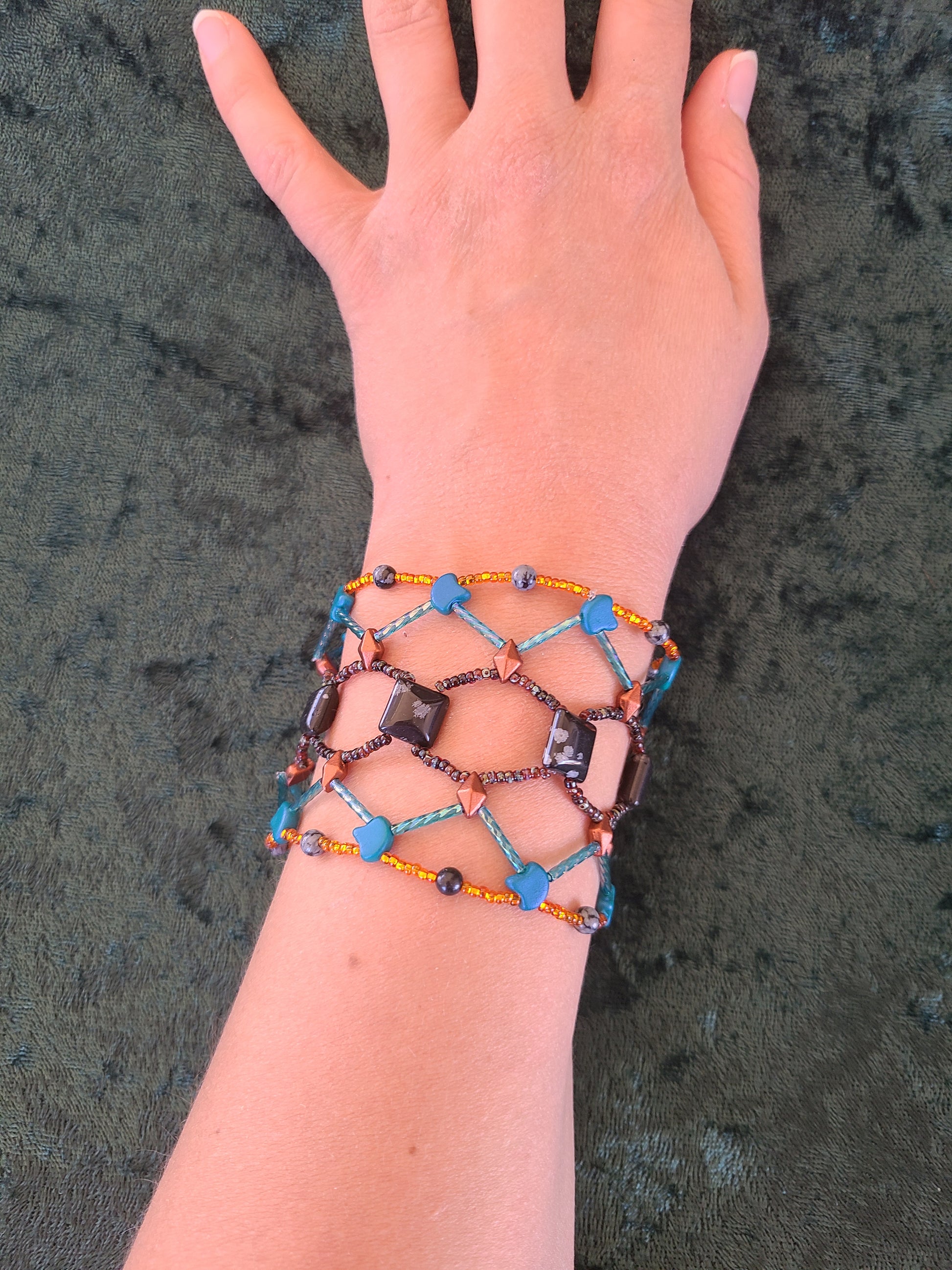 This bracelet plays with contrast and clean lines—coral reds, golden yellow, and black come together in a bold, geometric pattern with a striking lattice. The design is anchored by creamy opal beads that soften the sharp shapes just enough to keep it wearable.