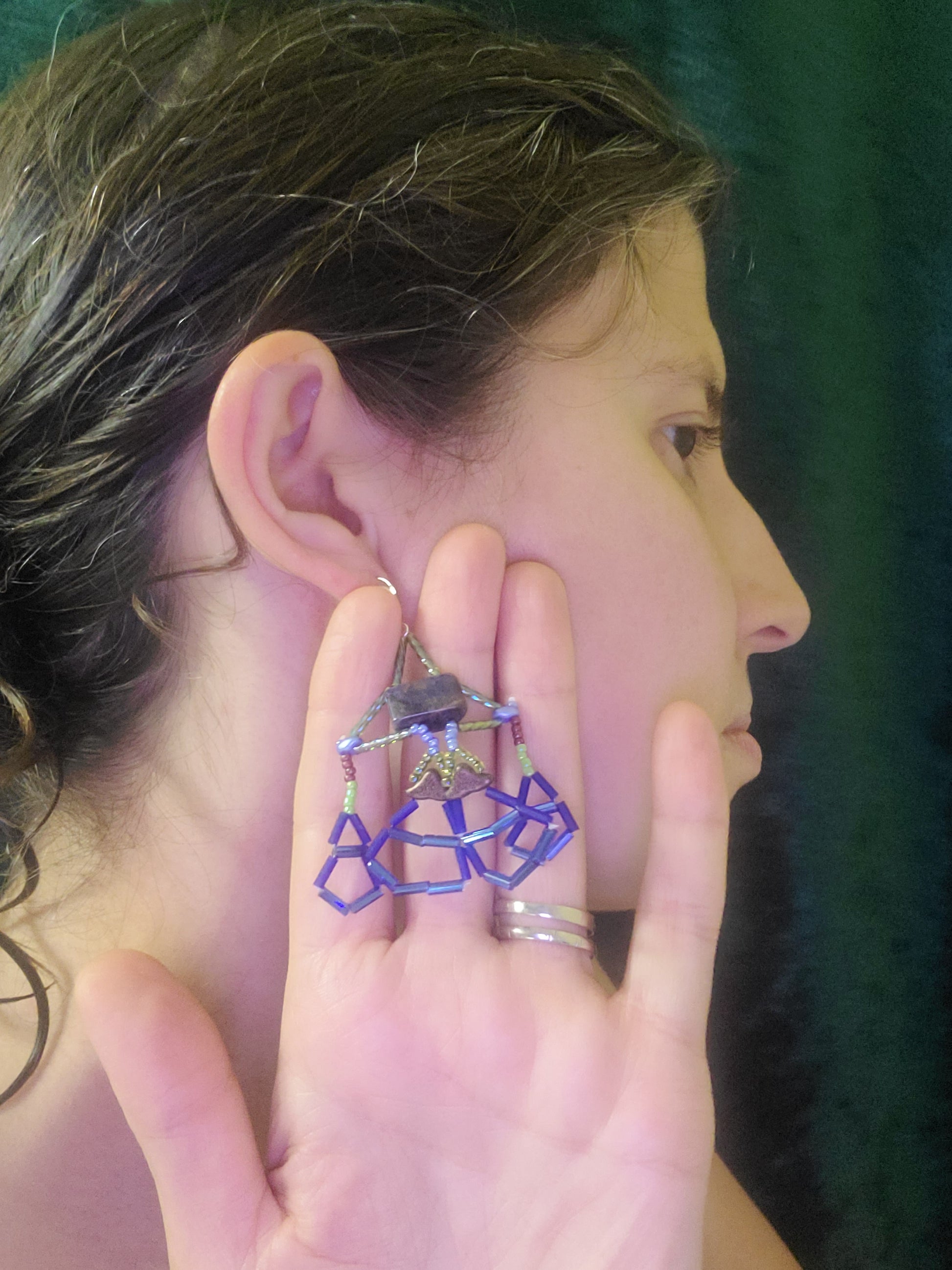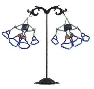 Inspired by urban architecture, these earrings feature deep blue sodalite beads interwoven with bold geometric shapes and vibrant pops of green and pink. The layered design incorporates angular details and delicate dangling strands, creating a modern, structured look. Lightweight and versatile, they’re perfect for gallery openings, cocktail hours, or stylish evenings out. Pair them with a tailored blazer and trousers for a sleek urban vibe or a minimalist black dress to let their contemporary artistry take center stage.