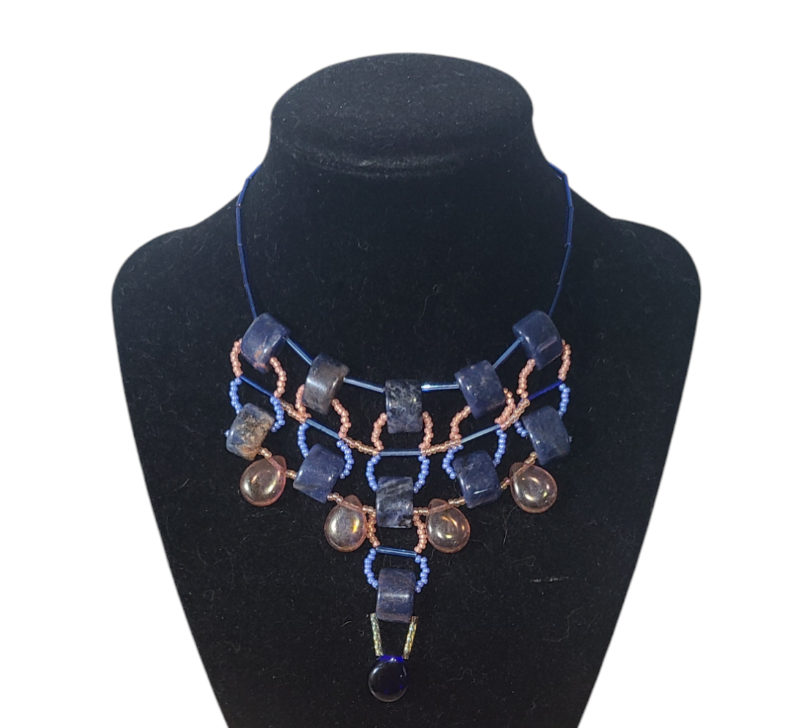 This bold necklace features chunky sodalite stones framed by looped beadwork in matte peach and bright blue. The structure is inspired by traditional Moroccan metalwork, with linked shapes that give it an architectural feel. Iridescent glass drops add contrast and movement, and a deep cobalt glass bead finishes the center strand.