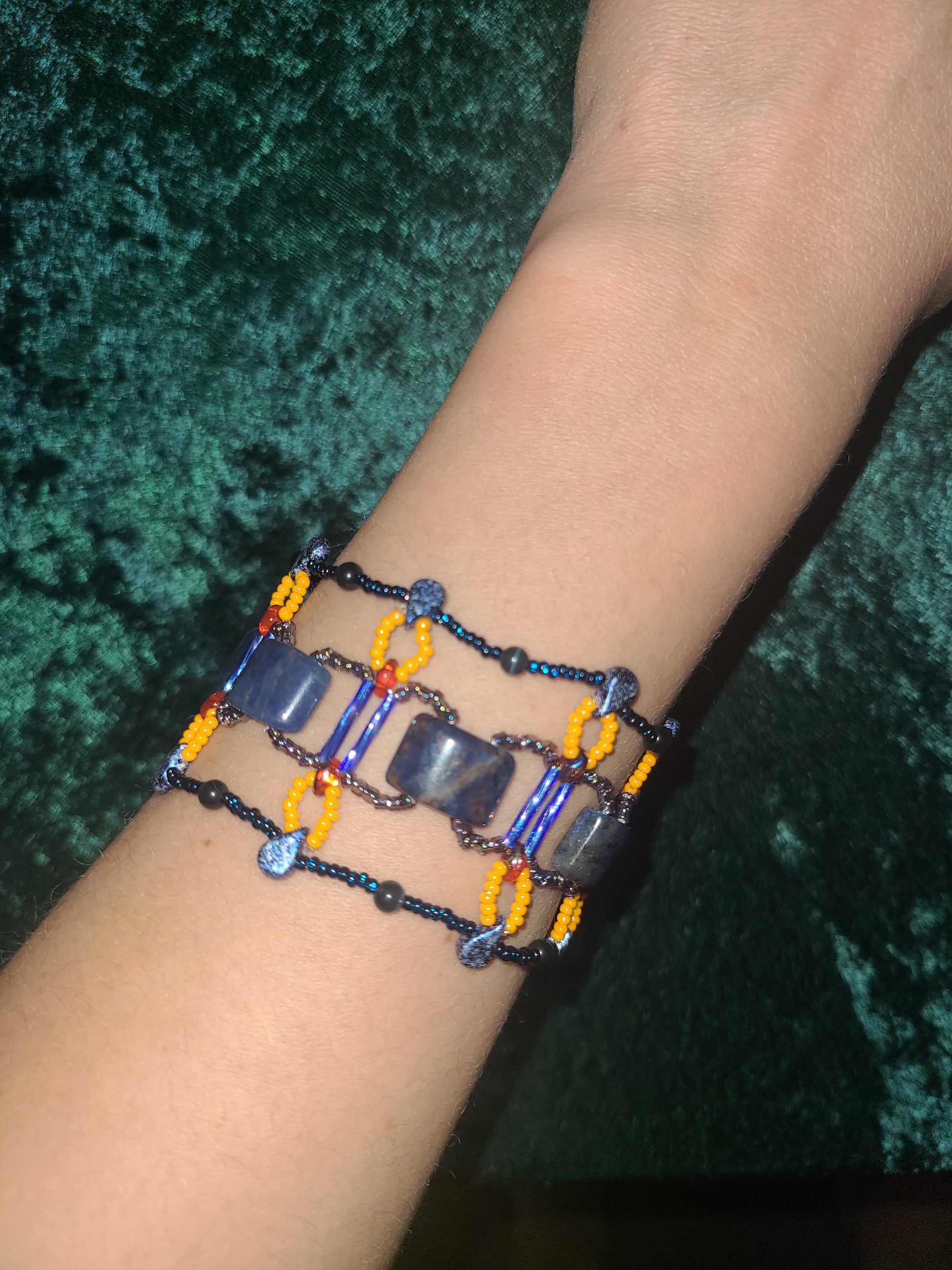 Vibrant and architectural, this bracelet combines deep blue sodalite gemstones with bright yellow accents in a striking bridge-inspired design, accented with sapphire stones. The bold color palette and intricate beadwork make it perfect for those who love statement jewelry with a cosmopolitan flair. Style it with a crisp white shirt or a color-blocked outfit to amplify its adventurous vibe. Great for travel, art fairs, or adding a pop of color to your everyday look.