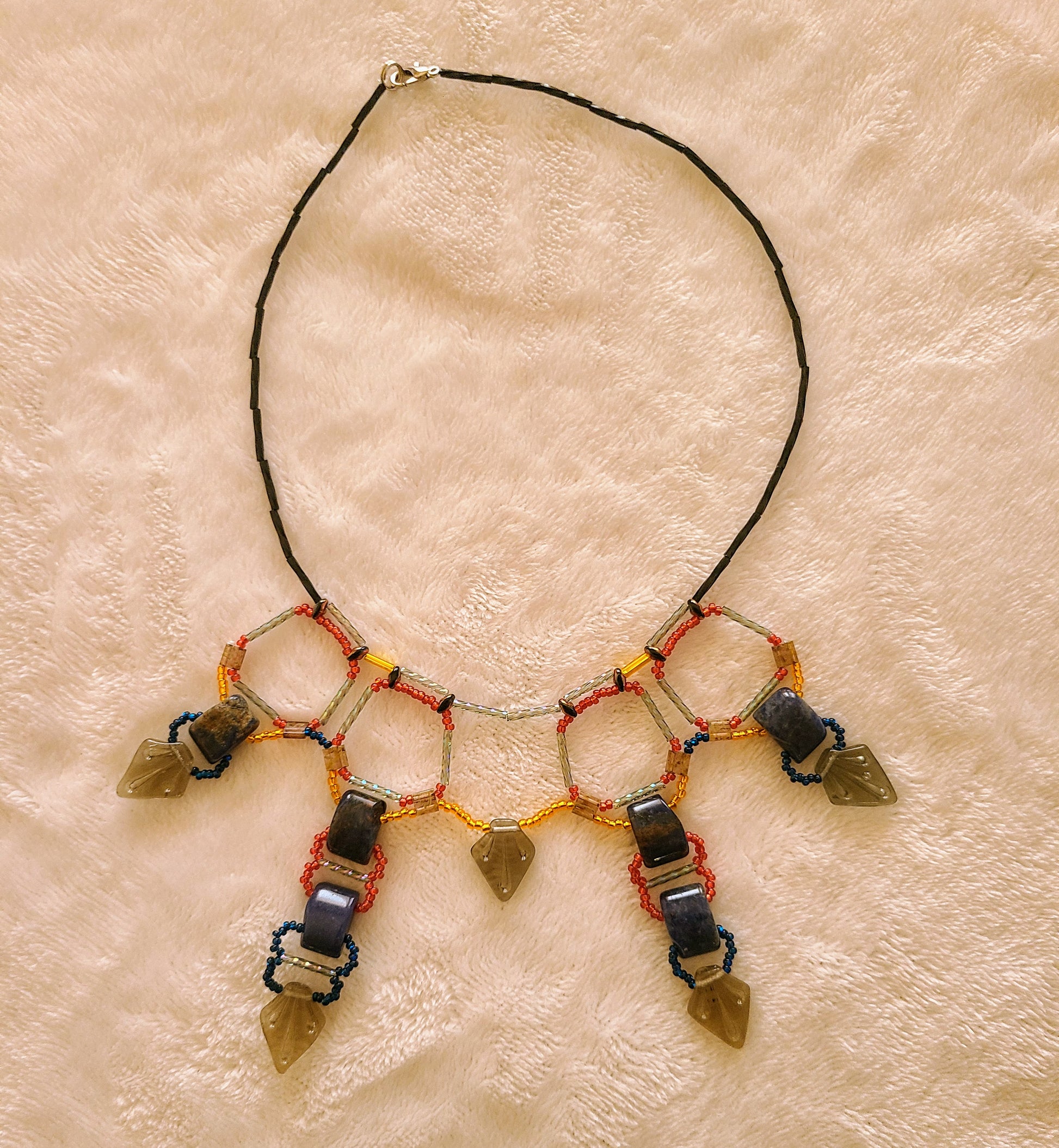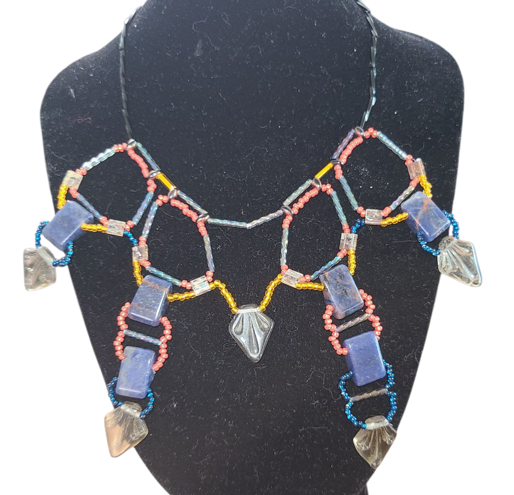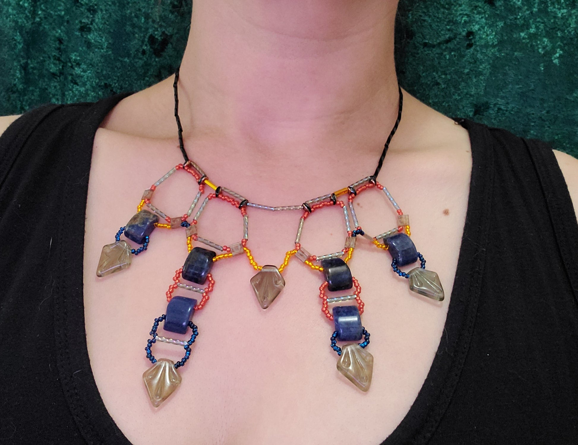 Bold and structured, this sodalite gemstone necklace uses blue and orange hexagon-shaped links along the collar, connecting to four vertical drops at the front. Matte blue sodalite rectangles are stacked within each drop and finished with faceted teardrops, accented by coral and yellow beading for contrast. This Mediterranean-inspired necklace that shines with a navy blue or burnt orange blouse and wide-legged trousers.
