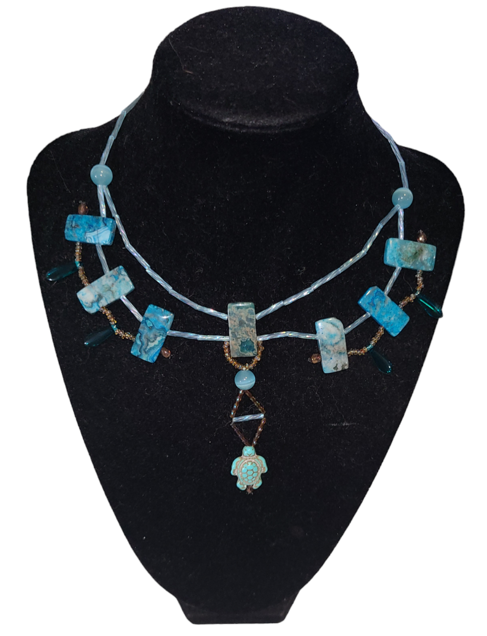 This necklace takes the shape of a phoenix, with rectangular slabs of teal crazy lace agate set against bronze-toned beadwork. The double-layered collar balances solid structure with airy flow, while a carved howlite turtle bead at the center adds a subtle, playful touch. Lightweight and eye-catching, it’s perfect for breezy resort days, summer gallery openings, or adding depth to a simple linen dress or jumpsuit. Pair it with warm neutrals, soft whites, or denim to let those oceanic hues really stand out.