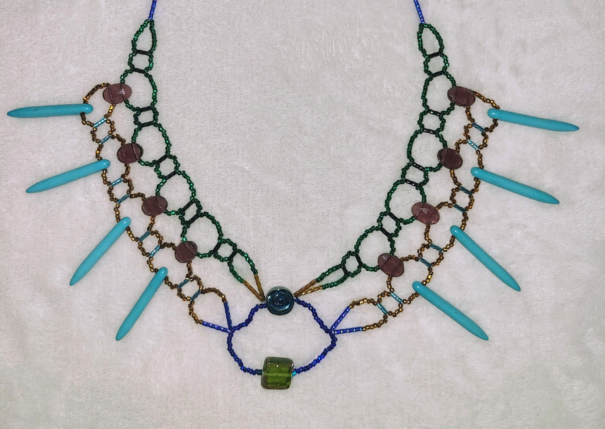 Featuring sleek teal howlite spikes arranged in a layered collar style, this piece blends modern aesthetics with bold, purple, amber and emerald tones. The intricate beadwork adds depth, making it perfect for professional settings or evenings out. Pair with tailored outfits or solid-colored tops for a polished, confident style.