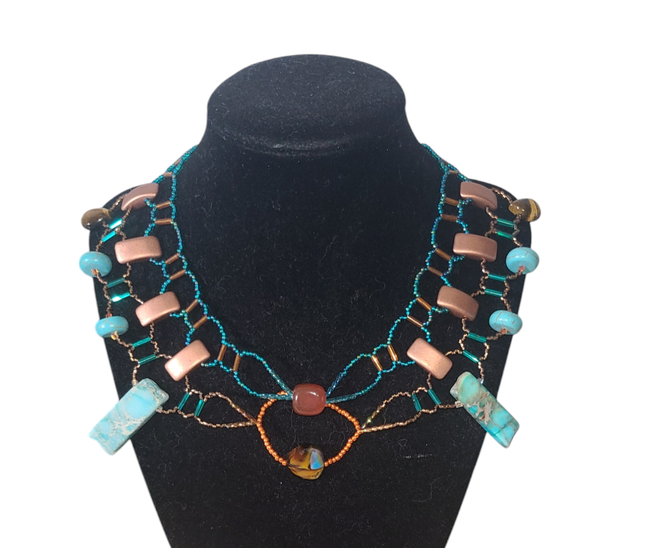 Earthy teal jasper stones are paired with rich bronze and turquoise tones, creating a striking collar design inspired by ancient Egyptian aesthetics. With its regal appearance, this necklace is ideal for formal events, gallery openings, or adding sophistication to an evening outfit. Pair with jewel-toned blouses or dresses for a timeless look.
