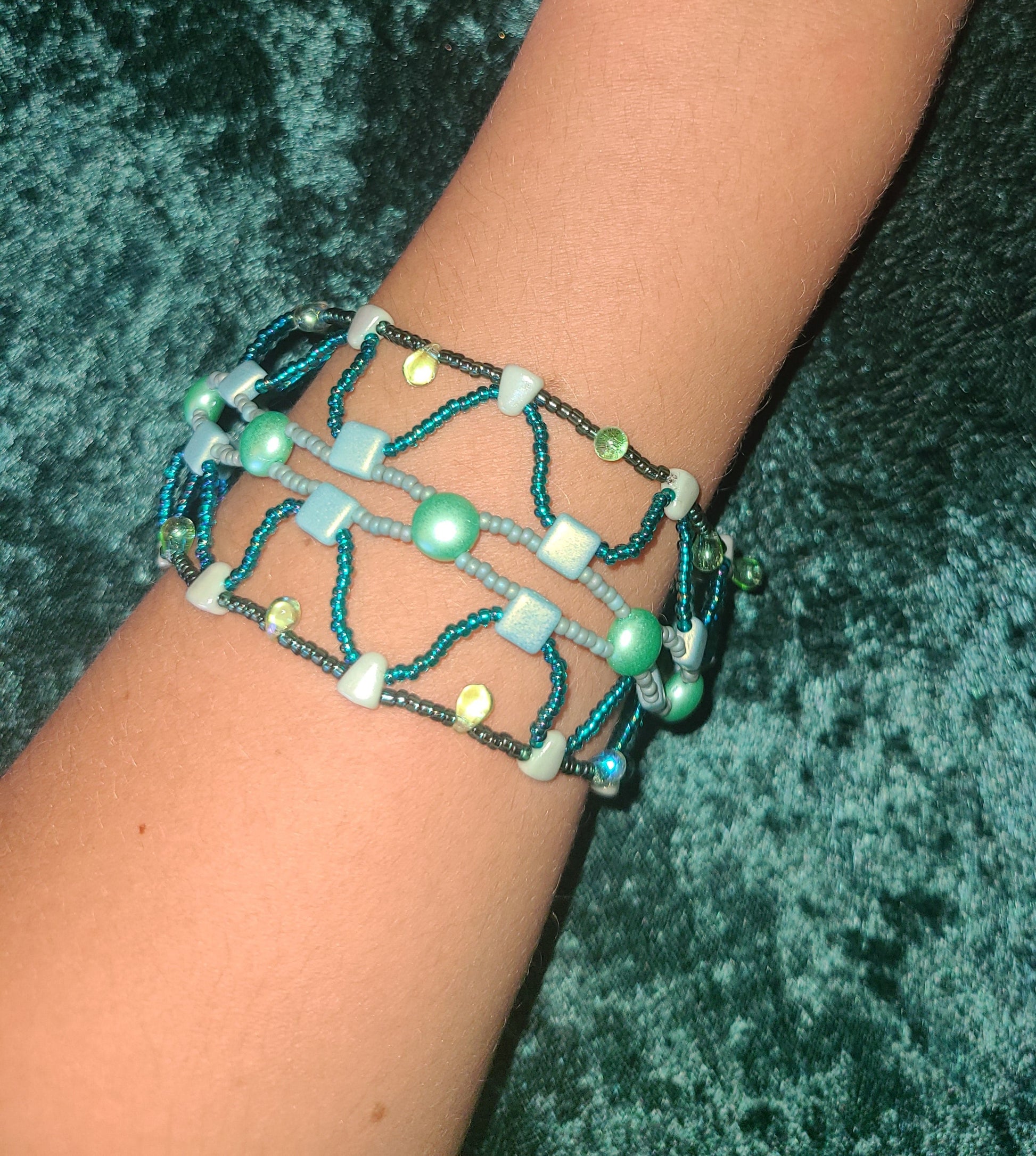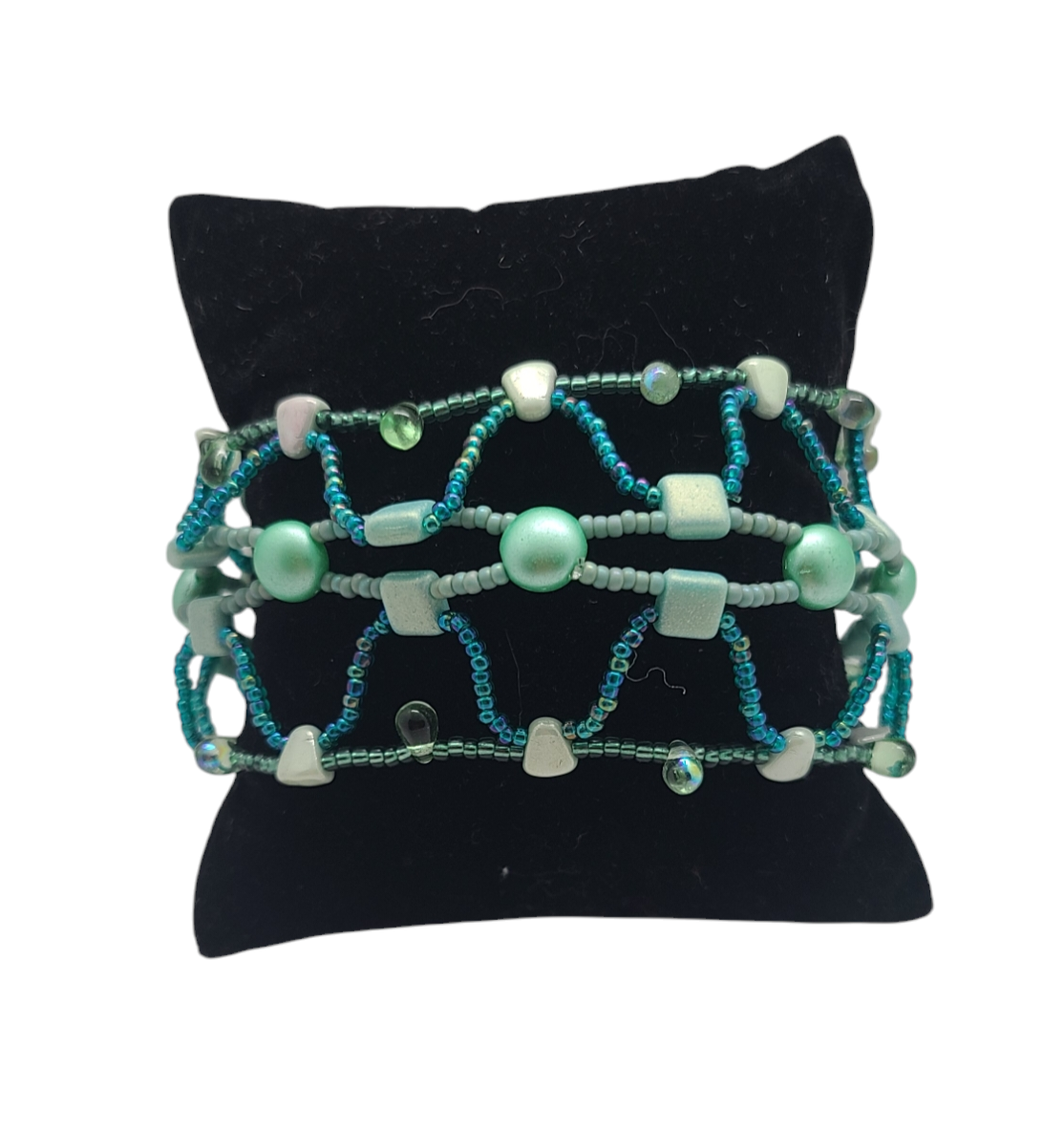 Soft mint-green glass beads and teal accents intertwine in this bohemian-inspired cuff bracelet, creating a fresh, nature-inspired palette. The design combines delicate textures with bold patterns, making it ideal for pairing with flowy maxi dresses, linen tops, or casual weekend wear. Whether you're enjoying an outdoor concert or an artisan market, this piece adds a touch of effortless sophistication.